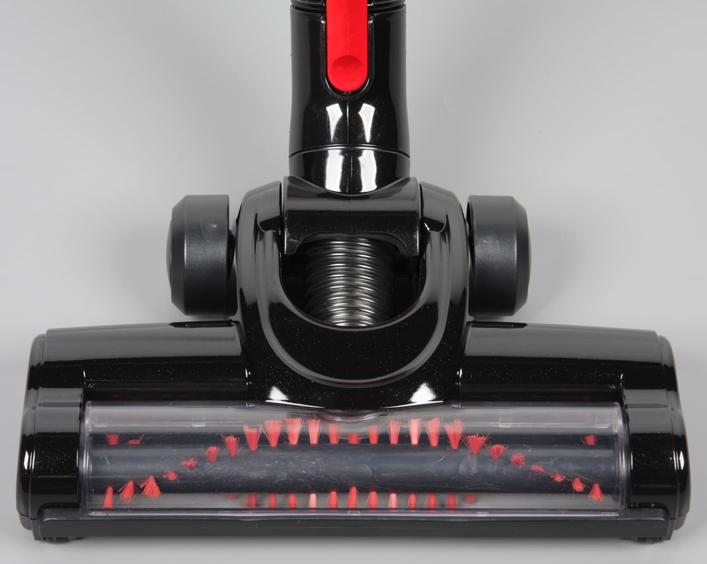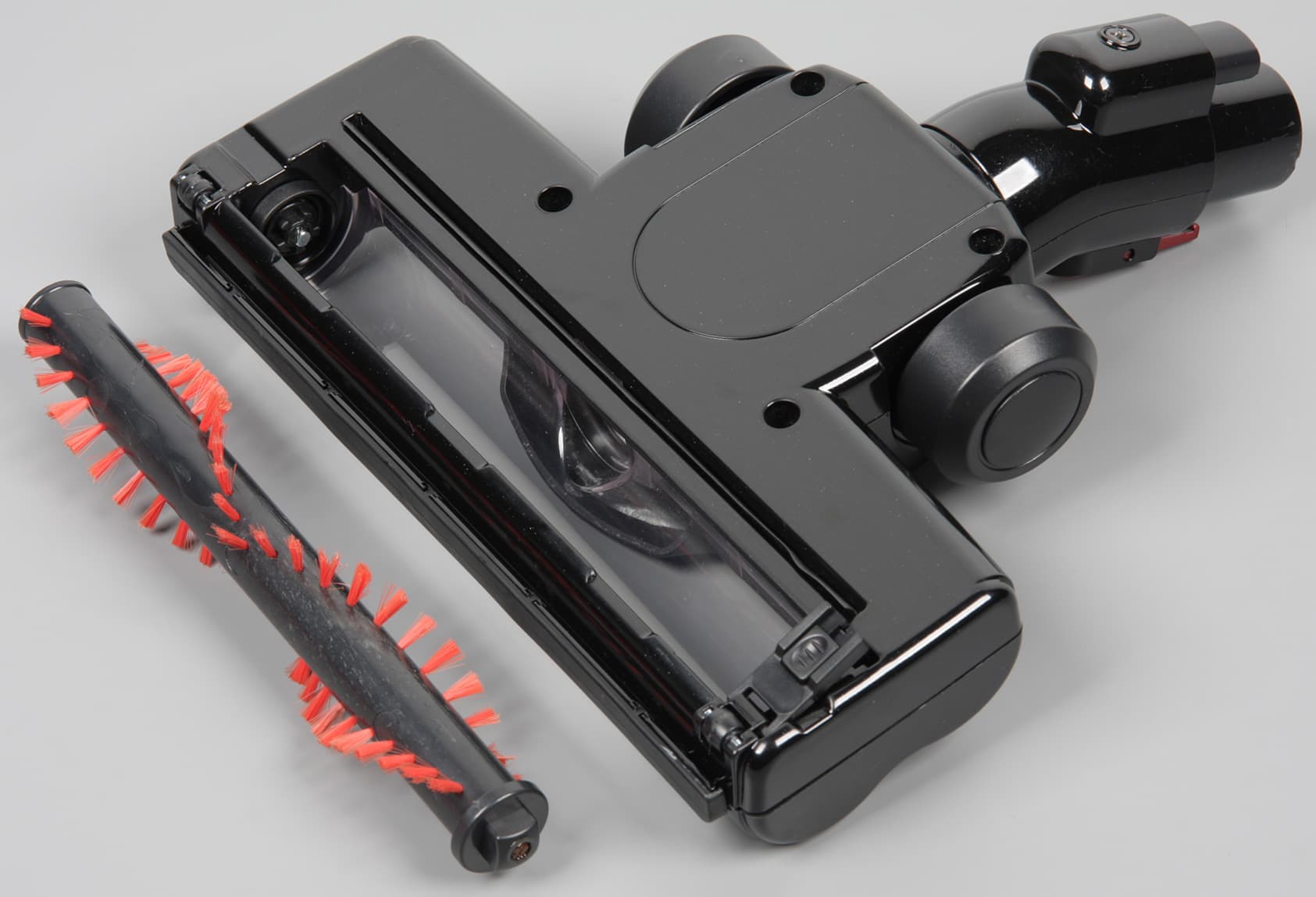 При необходимости фильтр и детали пылесборника можно промыть водой, но перед использованием все нужно тщательно высушить. Отметим, что крышка пылесбоника и складчатый фильтр имеют уплотнения из резины, а трубы и насадки соединяются между собой плотной посадкой на конус, при этом удлинительная труба и электрощетка дополнительно фиксируются защелками. Электрощетка имеет невысокий профиль. Она оснащена шарниром допускающим отклонение вверх-вниз по вертикали на примерно 90°. Поворот щетки по оси трубы, к сожалению, не достигает 180°, поэтому не получается положить трубу на пол и одновременно обеспечить плотное прижимание щетки к полу.