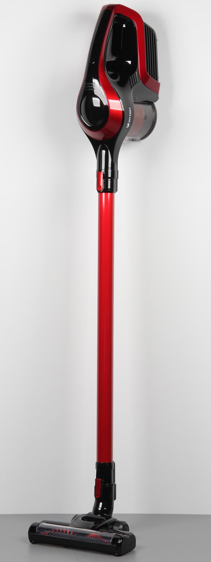 Управляется пылесос клавишей на ручке. Клавиша нажата — мотор крутится, не нажата — не крутится. Такой алгоритм без фиксации позволяет дополнительно экономить заряд батареи, так как пользователь с большей вероятностью будет выключать всасывание только в нужные моменты. Сверху по центру есть индикатор уровня заряда — три полоски, подсвечиваемые красным или зеленым.