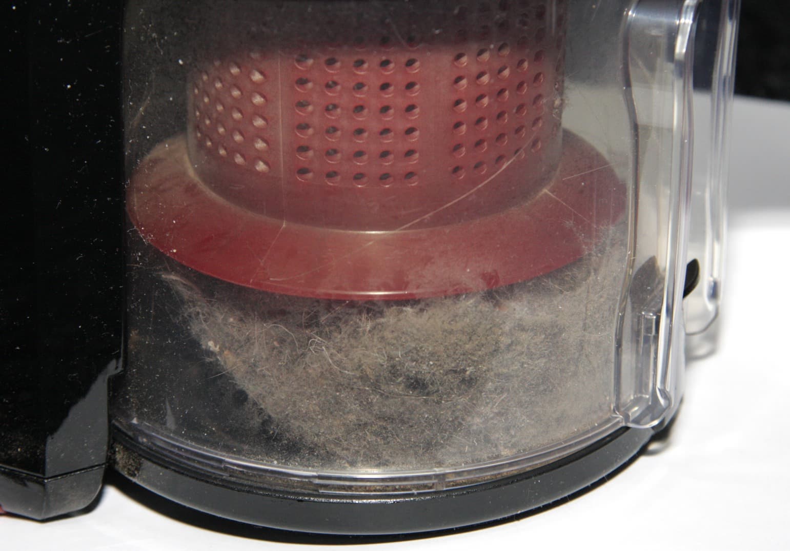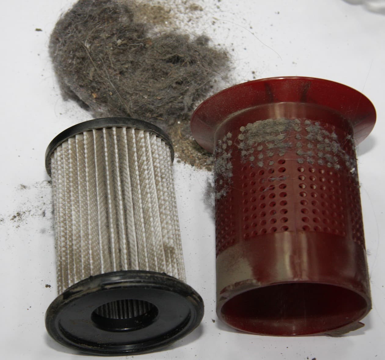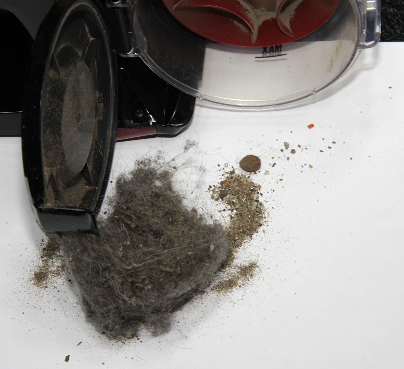 Сложнее всего оказалось вытряхивать мусор из складок фильтра. Видимо, проще ограничиваться постукиванием фильтра о край ведра, не обращая внимание на то немногое, что остается в складках, и с какой-то периодичность фильтр промывать и/или заменять. Вал с щетинками намотал на себя много волос, но все легко снялось пальцами без помощи инструментов.