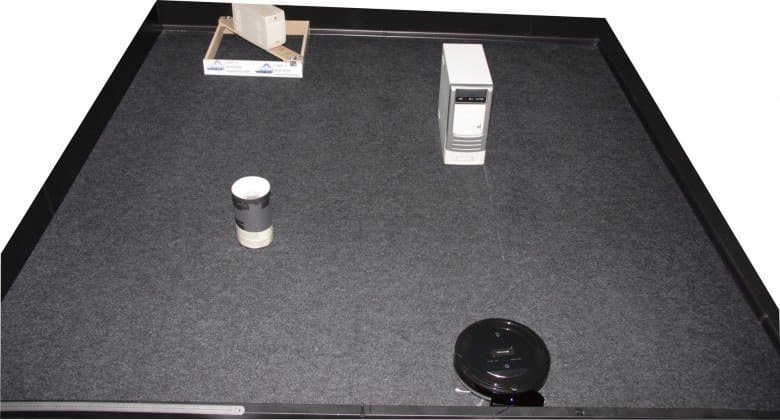 Загон шире робота всего на 5 см, но это не помешало роботу заехать туда несколько раз (пусть и не сразу). С базой робот обращается неаккуратно, может ее толкнуть и сдвинуть, но и убирает около нее хорошо, и при этом все равно успешно на базу паркуется. Перед высокими вертикальными и хорошо отражающими ИК-лучи стенками робот иногда затормаживает и меняет траекторию движения, но чаще всего робот к препятствиям подъезжает не снижая скорость вплоть до столкновения и срабатывания механического датчика в бампере. Почти полностью разрядив аккумулятор, робот выключает вентилятор и начинает искать базу. Видео ниже это демонстрирует: