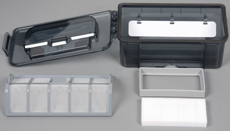 Ниже представлены результаты тестирования по нашей методике, подробно описанной в отдельной статье. Мы уже тестировали роботы-пылесосы с похожей системой сбора мусора и аналогичным набором фильтров, поэтому нам известно, что в том случае, если нет основной щетки, то складчатый фильтр существенно уменьшает поток воздуха и сильно снижает эффективность уборки нашего тестового мусора в виде риса. В итоге в варианте уборки с блоком без щетки мы собирались изъять складчатый фильтр, благо конструкция пылесборника это позволяет сделать без нарушения герметичности, но забыли это сделать. Вопреки ожиданиям, даже с этим фильтром эффективность уборки осталась на высоком уровне.