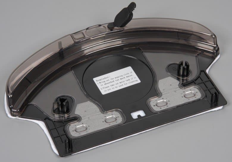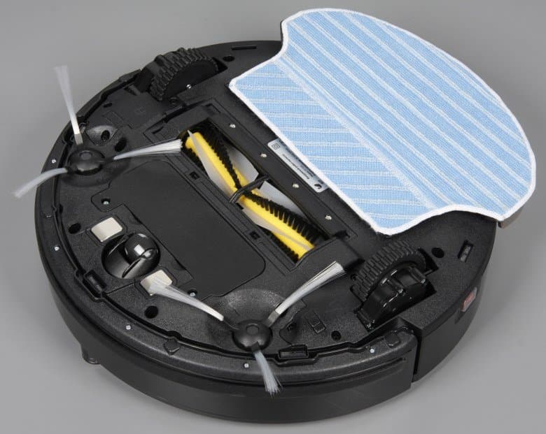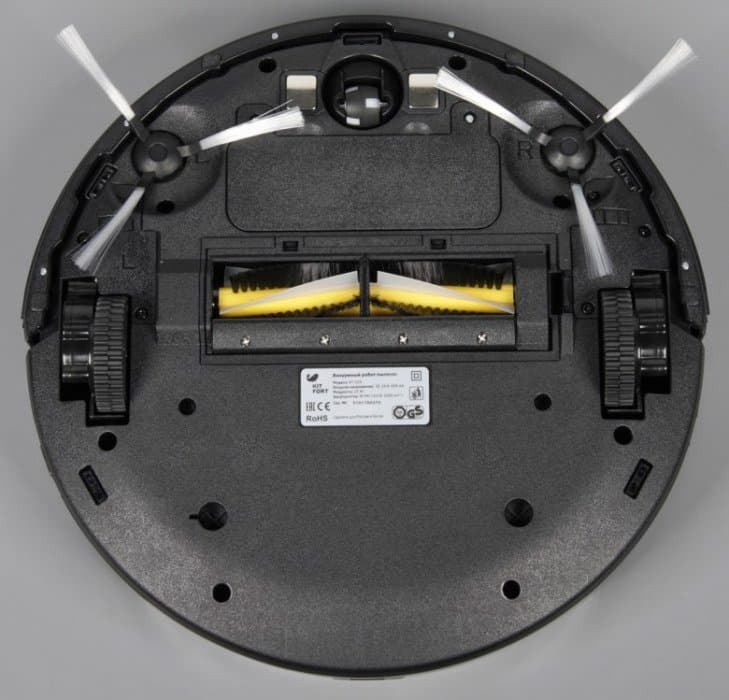 На днище находятся две контактные площадки, передний опорный поворотный ролик, две боковые щетки, крышка батарейного отсека, отсек уборочного блока и два ведущих колеса. Ближе к краю расположены пять ИК-датчиков перепада высоты, благодаря которым робот-пылесос может избежать падения со ступенек.