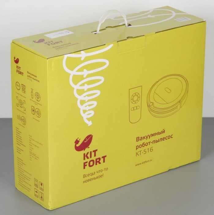 Робот-пылесос Kitfort KT-516 упакован в коробку яркого лимонного цвета, что подтверждает эмпирическое правило — использование одного яркого цвета для фона упаковки и обложки руководства является элементом фирменного стиля компании Kitfort. Коробка оснащена пластиковой ручкой, поэтому донести покупку до дома будет нетрудно.