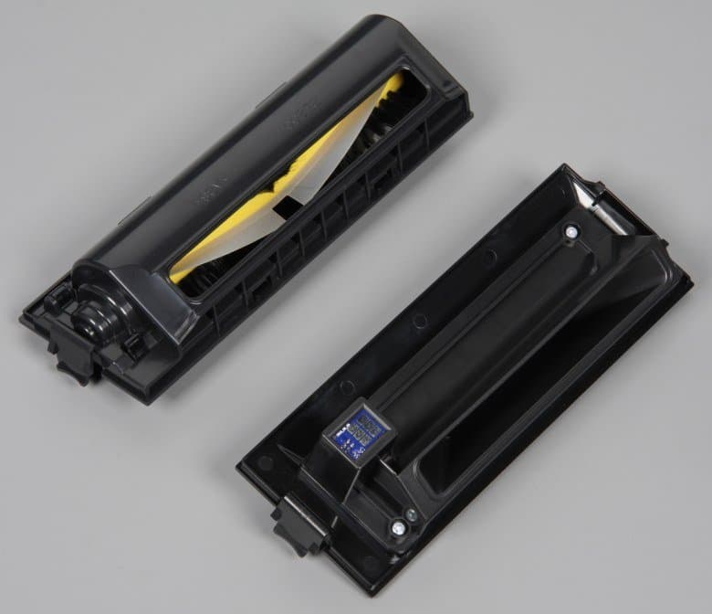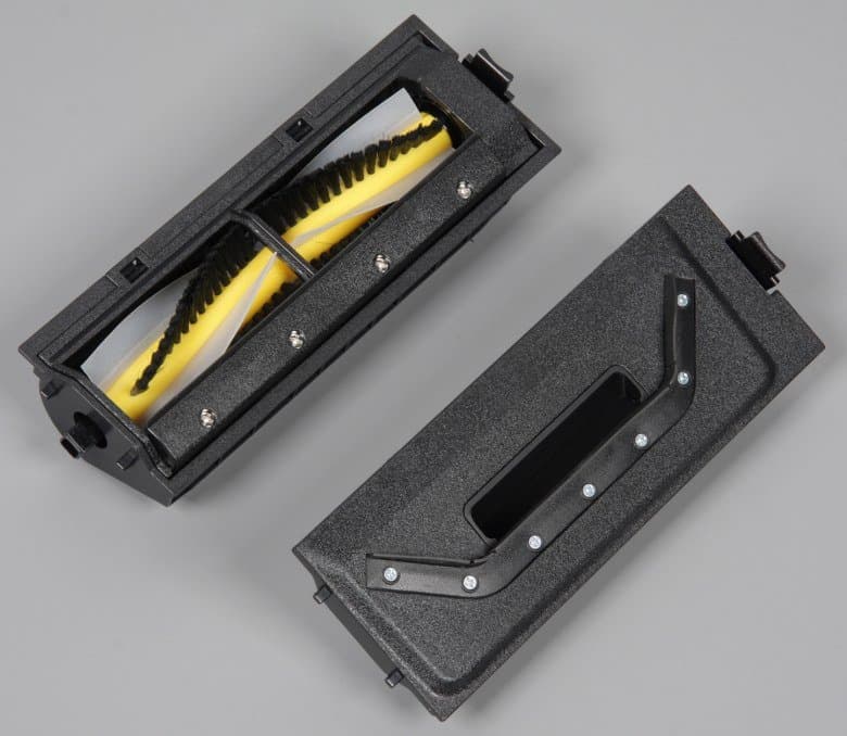 Блок без щетки имеет резиновую юбку-скребок и оптический датчик засора воздуховода. Этот блок лучше использовать для уборки легкого мусора с гладких полов, например, шерсти и пыли с ламината. Блок со щеткой активнее воздействует на убираемую поверхность, он лучше справится с уборкой ковровых покрытий и крупного тяжелого мусора, который щетка может закинуть в пылесборник по инерции. Правда, на вращающуюся щетку будут наматываться волосы, нитки, волокна и т. д. Вал щетки гладкий и относительно большого диаметра — это облегчает освобождение вала просто пальцами без помощи инструментов от всего намотавшегося. Щетина на этой щетке относительно мягкая, а лопасти-скребки из полупрозрачного пластика тонкие, нежесткие, но упругие. Рабочая ширина щетки 150 мм. Стальная ось в торце щетки вращается в подшипнике скольжения в виде бронзовой втулки. Это правильное конструктивное решение, так как подшипники качения в этом узле рано или поздно заклинивает, из-за намотавшихся на сепаратор волос, шерсти и прочего. Щетка в блоке фиксируется рамкой из черного пластика. На этой рамке есть резиновый скребок, который помогает щетке подхватывать мусор с пола и забрасывать его в пылесборник. Край рамки со скребком ходит вверх-вниз на 4 мм, что позволят скребку следовать рельефу пола. Часть скребка, выступающая внутрь, помогает снимать мусор со щетины и лопастей щетки. На рамке есть перемычка, которая уменьшает вероятность наматывания на щетку краев ковриков и т. д. Блок со щеткой легко разбирается для инспекции и очистки — снимается рамка, вставка с подшипником, защитный чехол подшипника, а скребки вытягиваются из направляющих.