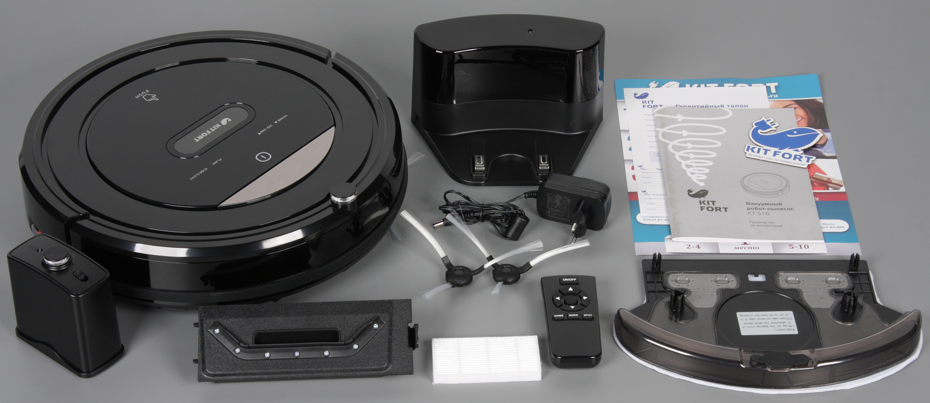 В комплект поставки входят почти все необходимые для работы аксессуары, почти, так как по паре элементов питания типа AAA для пульта и типа D для виртуальной стены пользователю придется покупать отдельно. Запасные части и расходные материалы в комплекте представлены сменным складчатым фильтром, салфеткой из микроволокна и двумя боковыми щеточками.