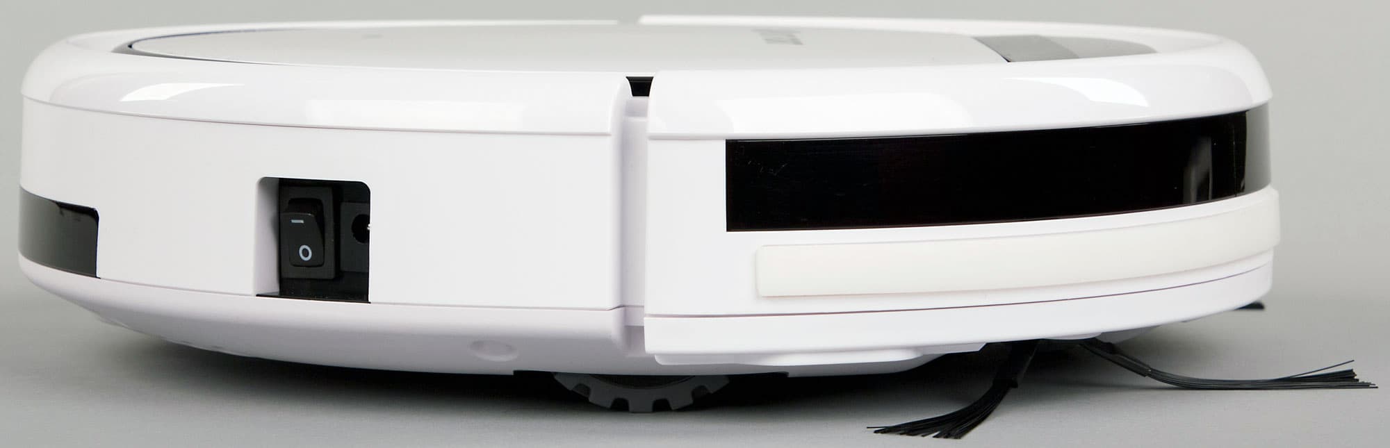 Корпус робота изготовлен в основном из белого пластика с матовой поверхностью. Такое сочетание отличается повышенной маркостью. Верхняя часть корпуса и крышка отсека пылесборника тоже из белого пластика, но уже с зеркально-гладкой поверхностью. Отметим, что белый цвет корпуса позволяет быстрее найти робота в темных закоулках квартиры, когда он по какой-то причине не вернется на базу. Сверху спереди есть декоративная вставка из толстого прозрачного пластика с серебристой подложкой, а крышка отсека пылесборника имеет обрамление из плотно тонированного пластика.