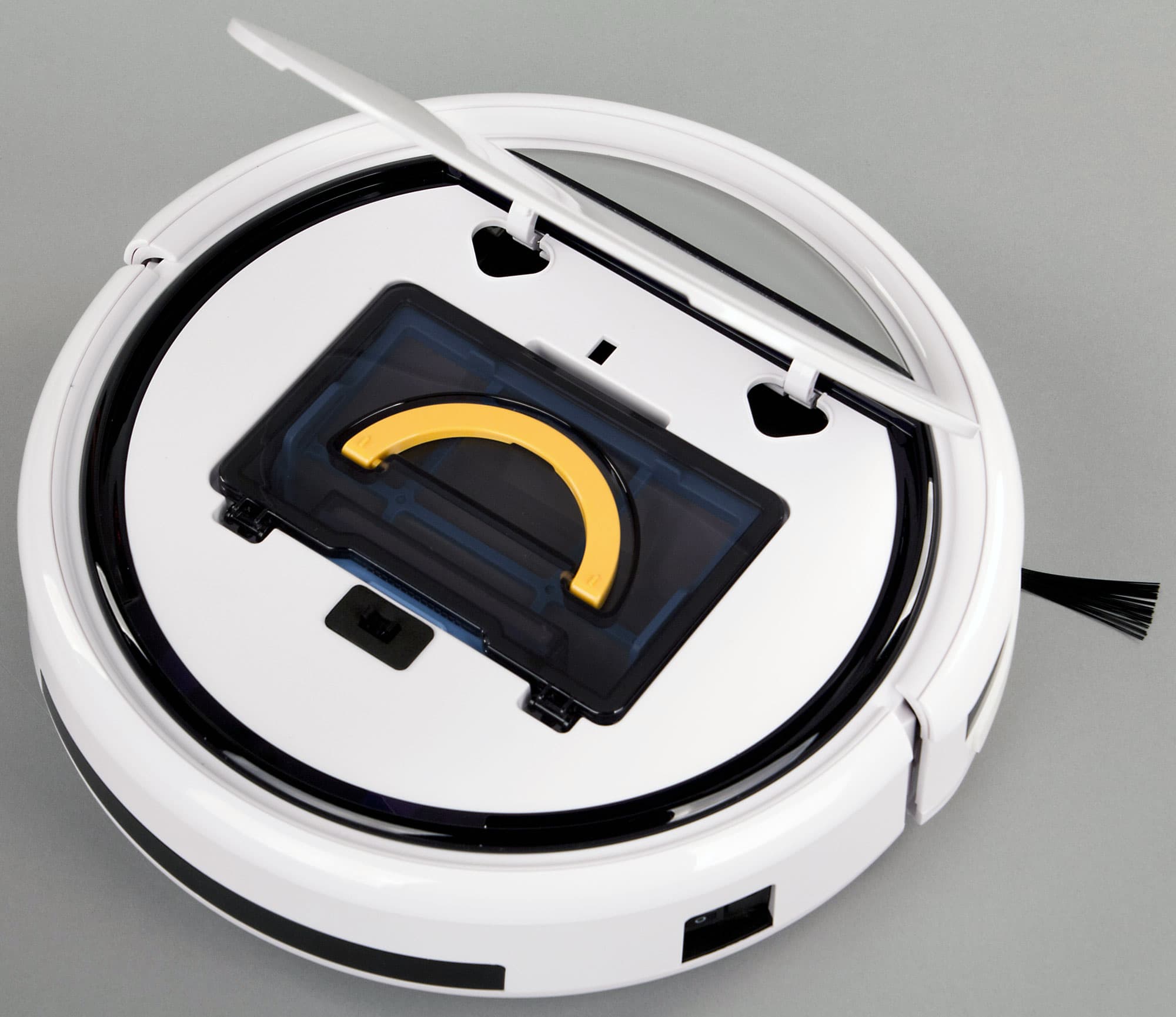 Дополнительно о своем состоянии робот информирует с помощью коротких и не очень громких звуковых сигналов. Отключить звуковое оповещение нельзя. Нажав на значок с надписью Push («нажми»), можно открыть крышку отсека пылесборника. Вынимается сам пылесборник за желтую ручку.