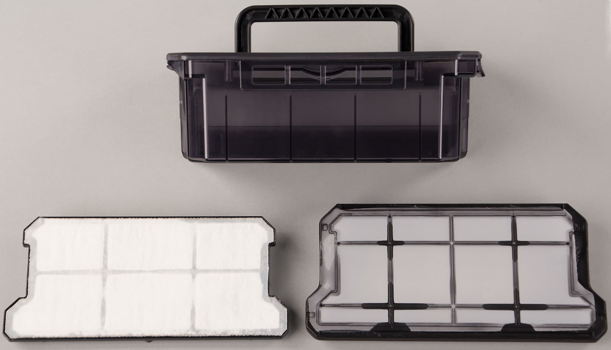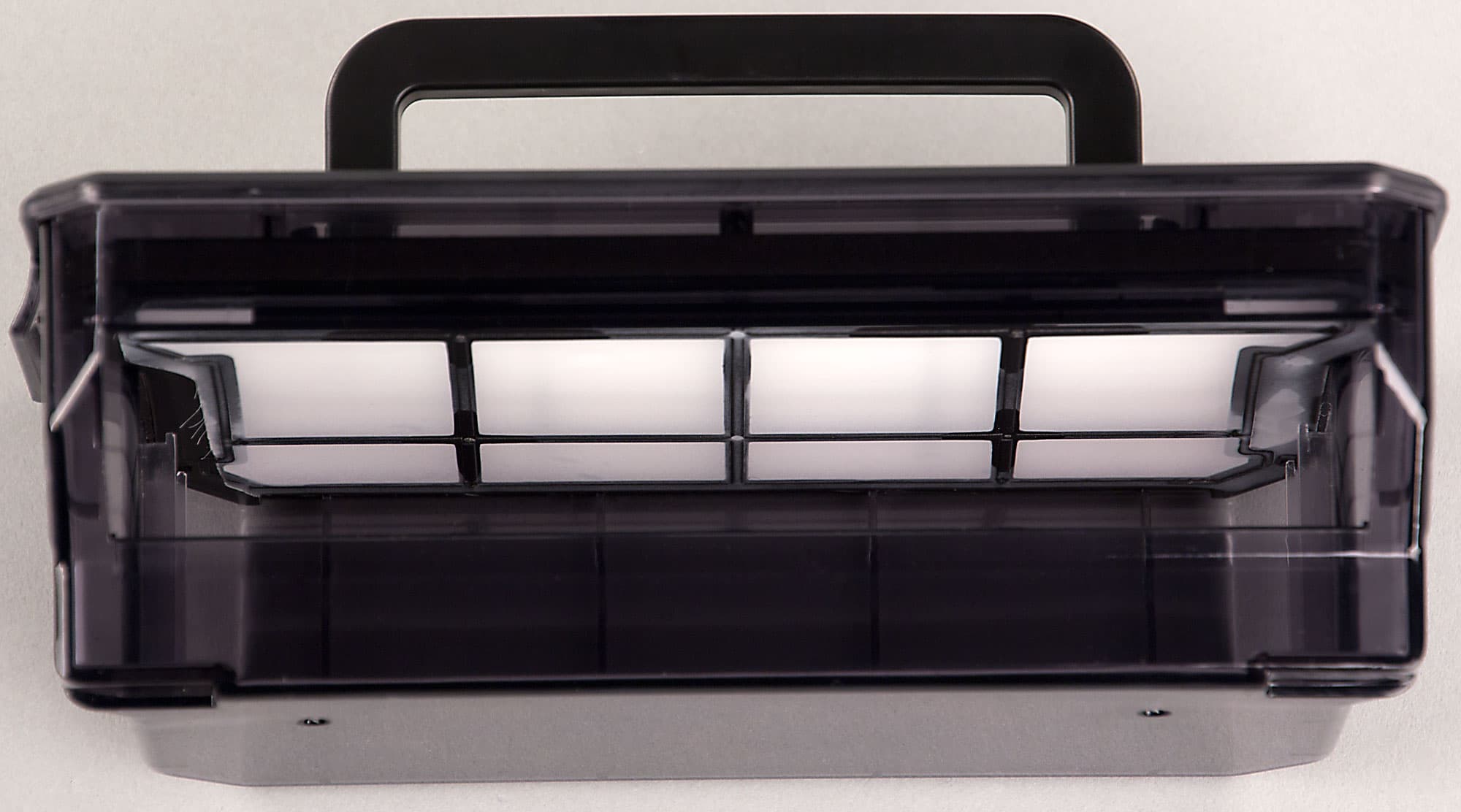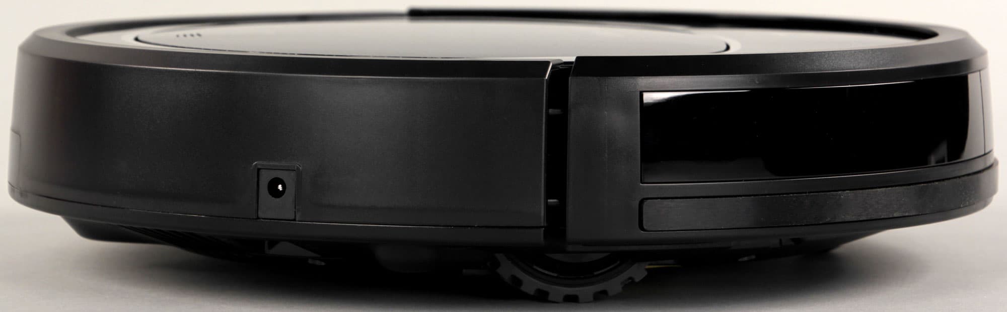 Первый слой — это пластиковая сеточка с очень мелкими ячейками, второй — из волокнистого материала. С нашей точки зрения такая многоступенчатая система фильтрации избыточна и только снижает воздушный поток, хватило бы и одного фильтра средней плотности. При уборке передняя боковая щеточка подгребает мусор к центру, затем частички мусора закидываются основной щеткой в пылесборник, а поток воздуха помогает засасывать в пылесборник самый легкий мусор. Крупные частички мусора задерживаются первым сетчатым фильтром, а мельчайшие пылинки остаются на втором более плотном фильтре. Упругие прокладки на всем пути от входного отверстия пылесборника до вентилятора исключают паразитный подсос воздуха мимо фильтров и пылесборника. Отметим, что вентилятора в самом пылесборнике нет, поэтому пылесборник и фильтры можно мыть под водой, главное потом все хорошо высушить. Плотный фильтр тонкой очистки рекомендуется менять после года использования. На правом боку находится разъем питания для прямой зарядки аккумулятора.
