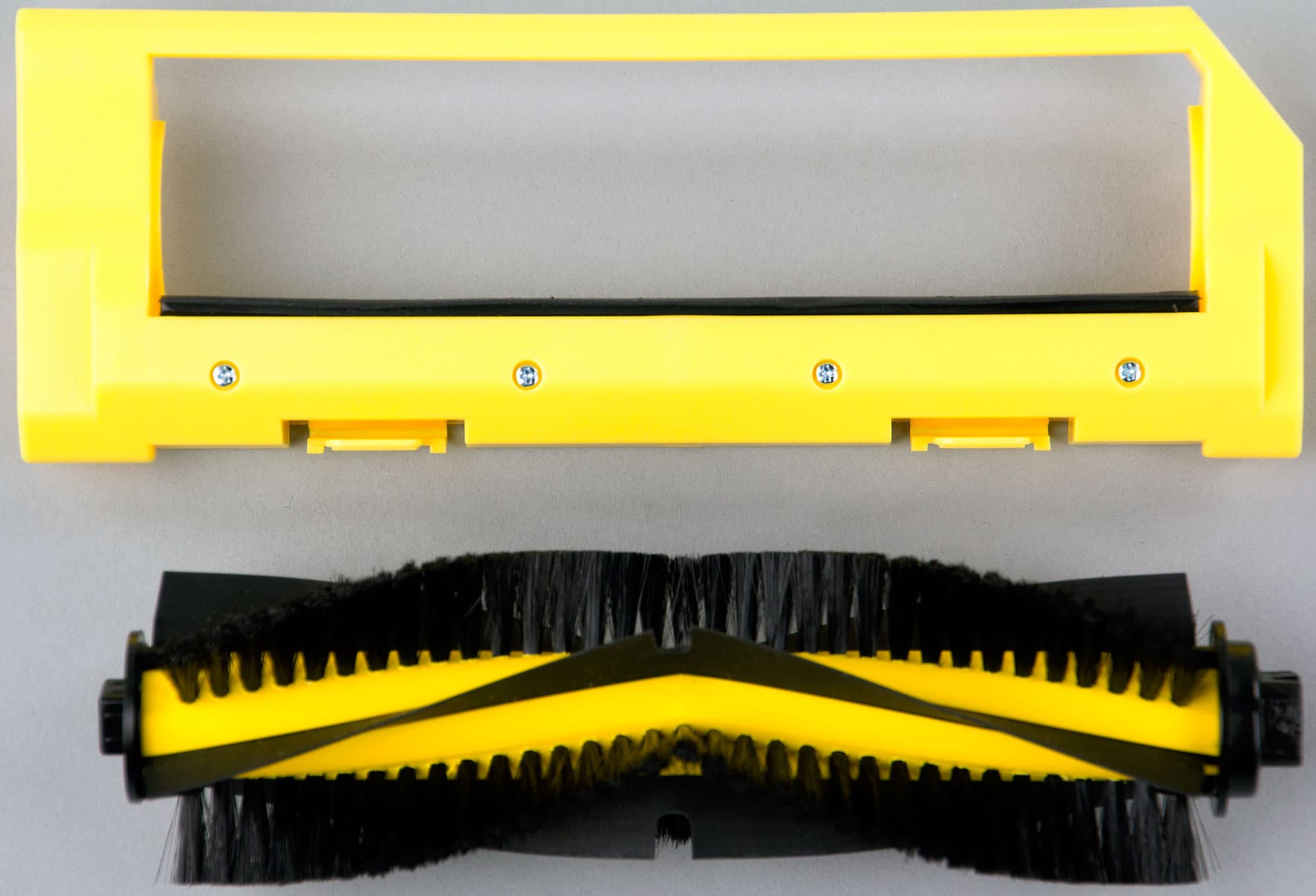 К оси привода щеточка крепится с помощью самореза с головкой под крестовую отвертку. Вал основной щетки гладкий и относительно большого диаметра — это облегчает освобождение вала просто пальцами без помощи инструментов от ниток, волос и прочего намотавшегося. Щетина на этой щетке имеет среднюю жесткость, а резиновые лопасти-скребки тонкие, нежесткие, но упругие. Стальная ось в торце щетки вращается в подшипнике скольжения в виде бронзовой втулки, привод щетки также оснащен бронзовым подшипником скольжения. Это правильное конструктивное решение, так как подшипники качения в этом узле рано или поздно заклинивает, из-за намотавшихся на сепаратор волос, шерсти и прочего. Щетка в узле фиксируется рамкой из желтого пластика. На этой рамке есть резиновый скребок, который помогает щетке подхватывать мусор с пола и забрасывать его в пылесборник.