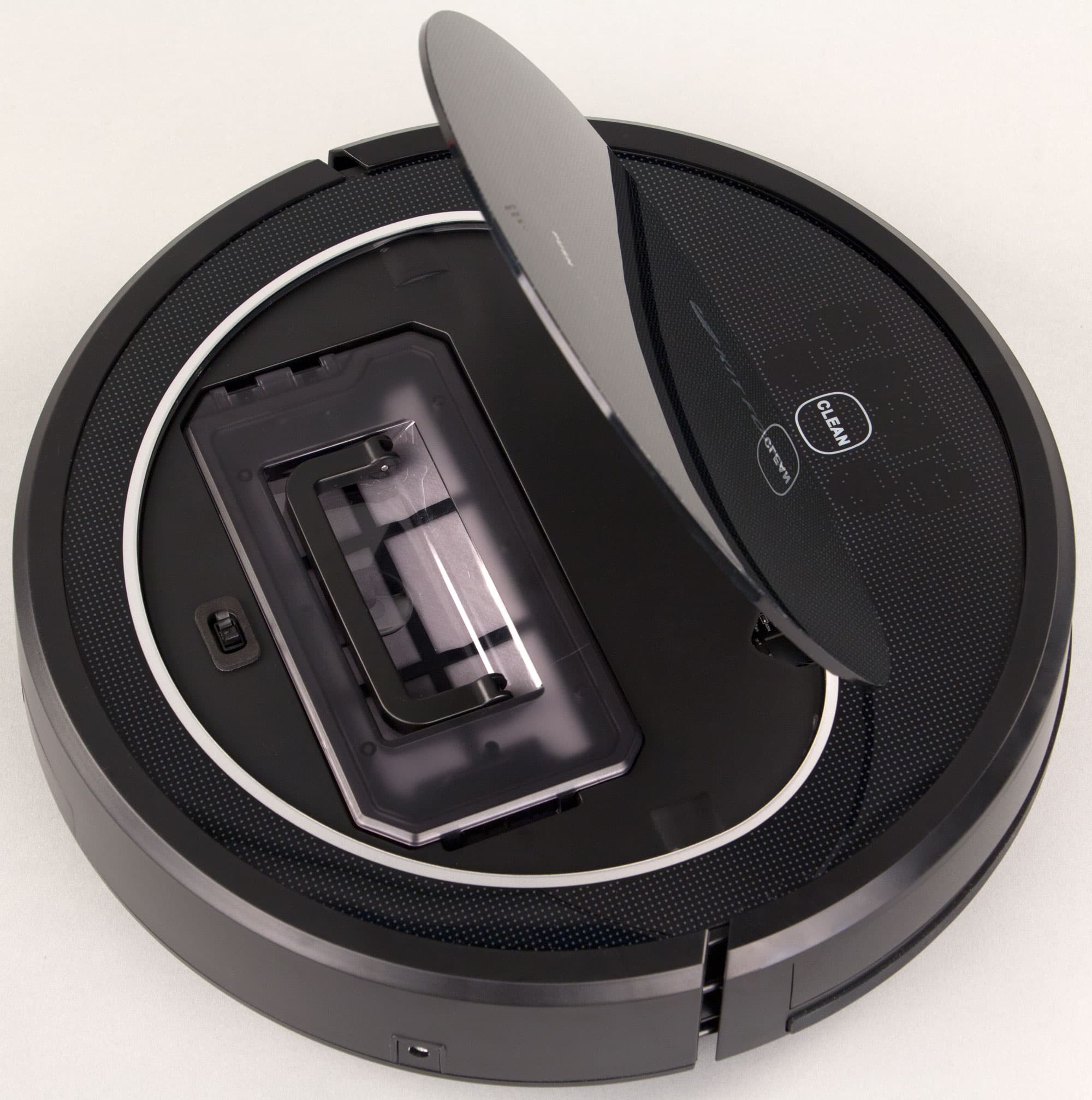Индикация достаточно яркая и контрастная. Дисплей дает информацию пользователю о том, чем в данный момент занят робот, а также о текущем уровне заряда, когда робот заряжается. Дополнительно о своем состоянии робот информирует с помощью коротких и не очень громких звуковых сигналов. Отключить звуковое оповещение нельзя. Нажав на значок с надписью Push («нажми»), можно открыть крышку отсека пылесборника. Вынимается сам пылесборник за откидывающуюся ручку.