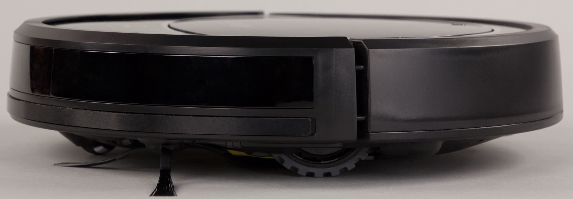 Отметим, что этот робот без проблем работал на черном ковролине, тогда как у большинства других роботов датчики перепада высоты приходилось деактивировать, чтобы роботы не считали черный пол провалом в никуда. Передний ролик изготовлен из черного упругого пластика чередующегося с белым и жестким. Сделано это не просто так, а для того, чтобы робот с помощью оптического датчика, расположенного под роликом, мог определять, перемещается ли он во время уборки, и если нет, то предпринимать попытки высвободиться или подать сигнал пользователю об ошибке. Боковая щеточка имеет длинную и жесткую щетину, пучки которой выходят из упругих поводков.