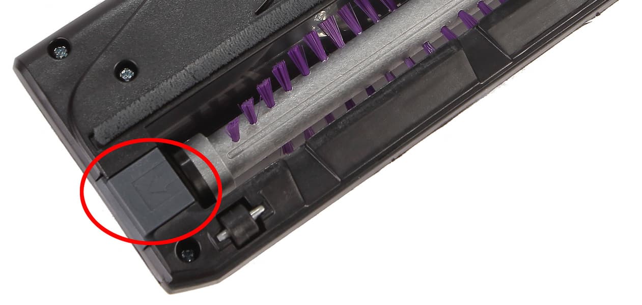 Уход за турбощеткой состоит в извлечении из нее собственно щетки — для этого есть рычажок, который необходимо сдвинуть в сторону в направлении, указанном стрелкой.