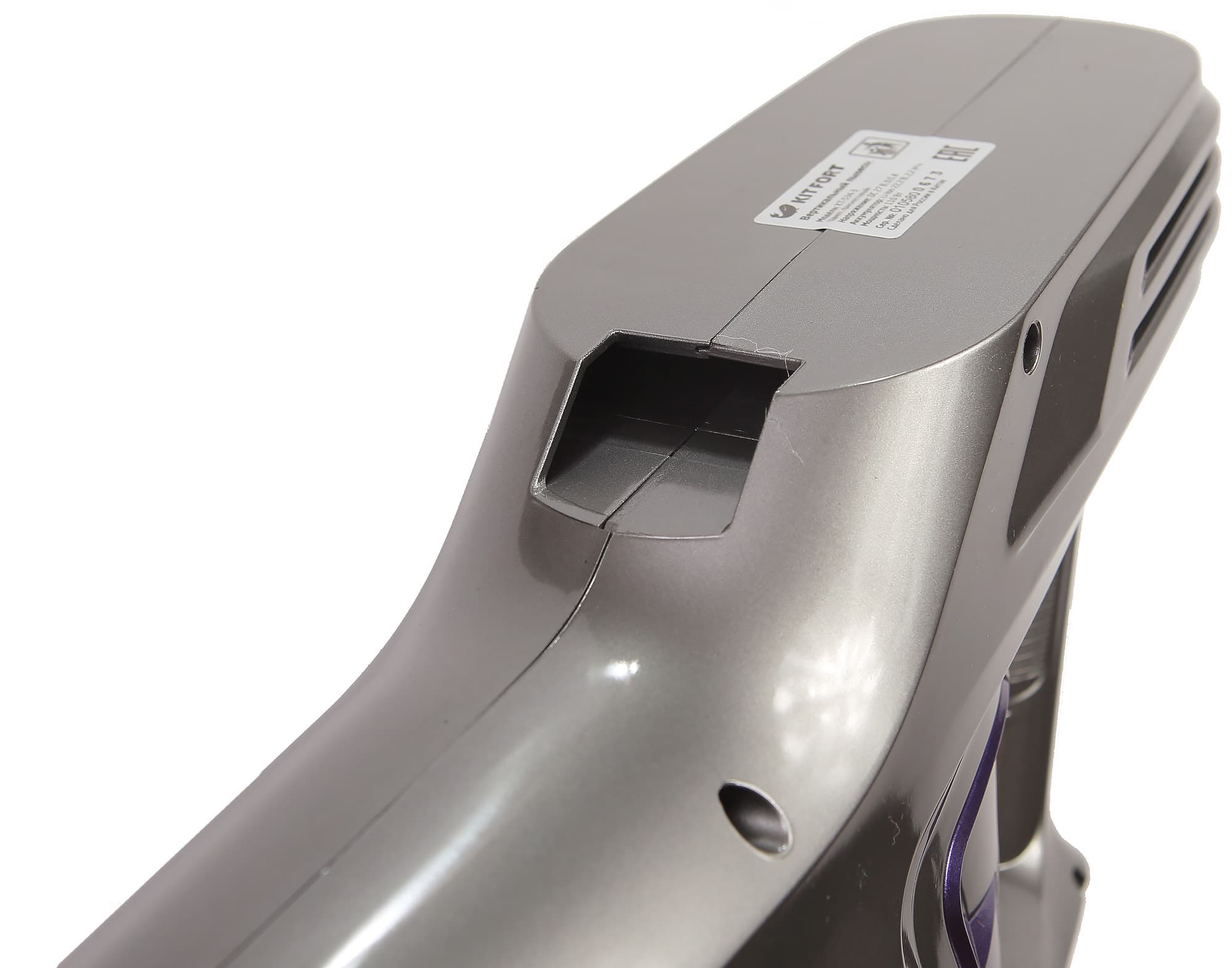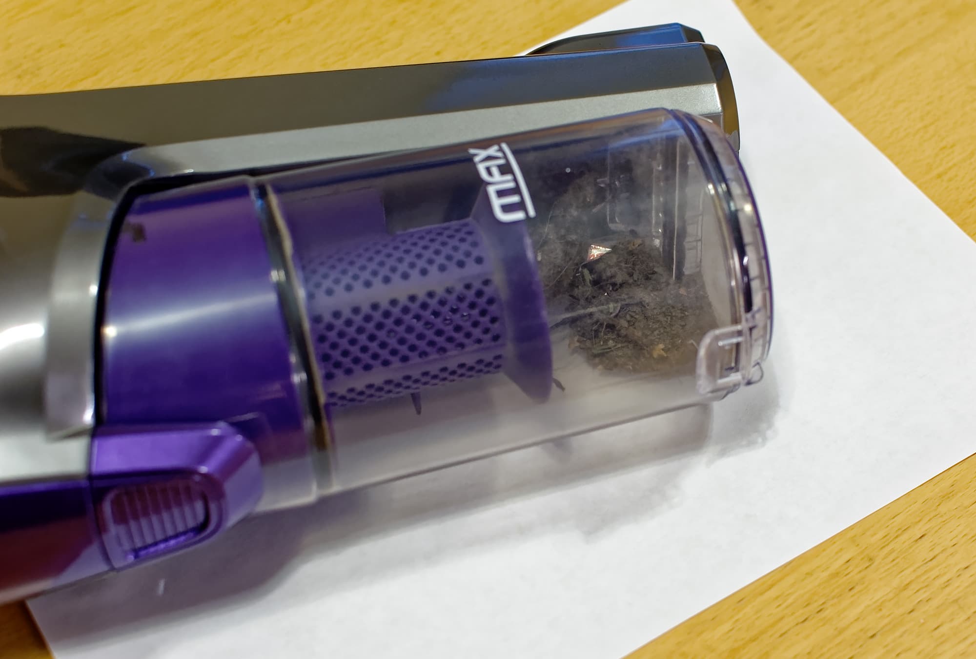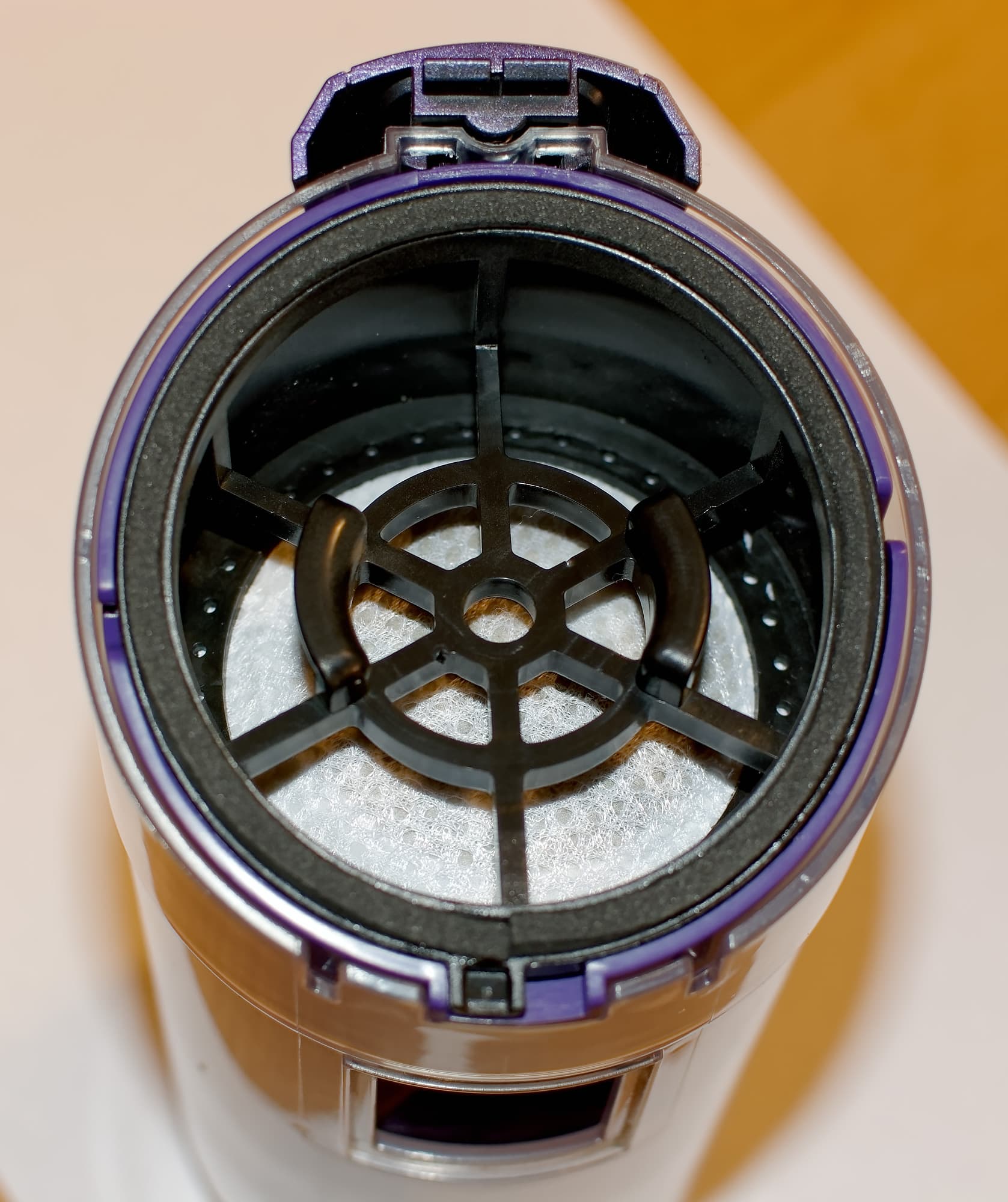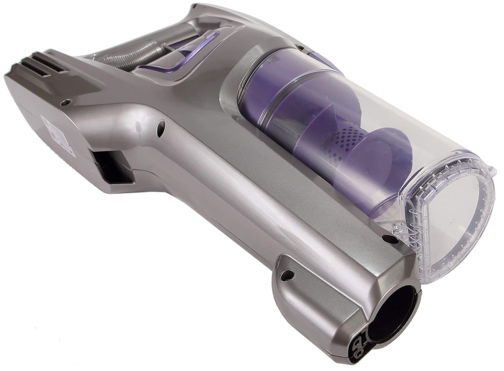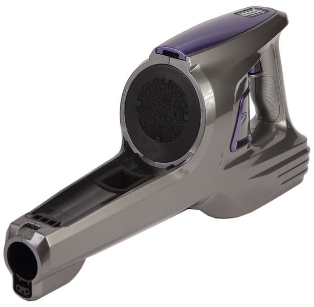 Прозрачный корпус пылесборника позволяет оценить степень его заполнения с первого взгляда, по крайней мере, пока он несильно поцарапался изнутри. Производитель указывает, что объем пылесборника равен 0,5 л, но это полный объем. Мы налили воды до отметки Max и, вылив, измерили ее объем — он был равен 275 мл. Дно пылесборника откидывается вниз, его можно опорожнить даже не отсоединяя от пылесоса. Циклон просто вынимается из пылесборника, он никак не закреплен. Пылесборник отсоединяется от моторного блока с помощью находящейся на нем фиолетовой защелки.