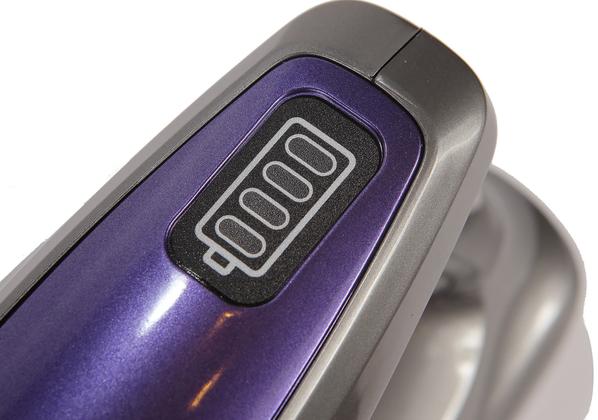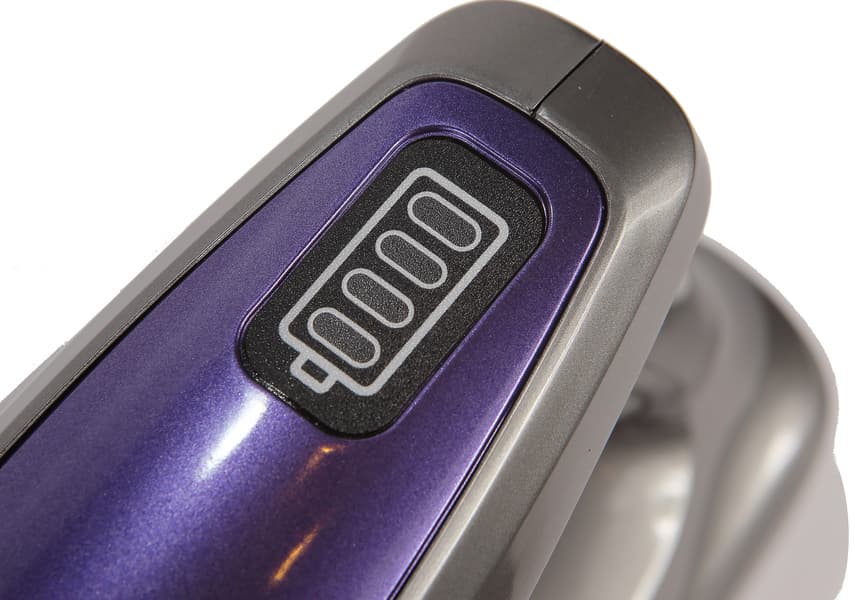 Индикатор уровня заряда расположен над кнопкой и снабжен четырьмя светящимися синим цветом секторами, которые горят во время зарядки и работы пылесоса. Интуитивно понятно, что чем больше секторов горит — тем выше уровень заряда.