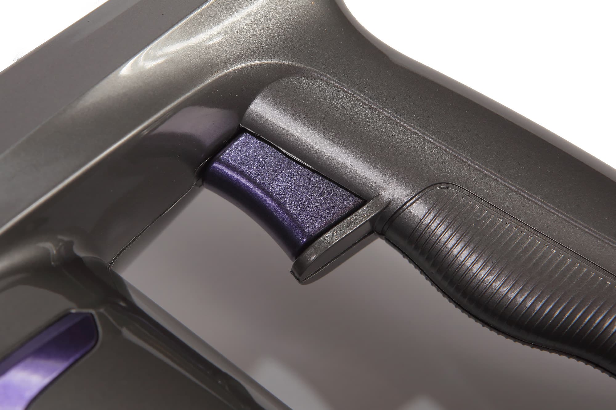Корпус изготовлен из пластика темно-серебристого цвета с фиолетовыми вставками (на сайте производителя предлагаются и другие цветовые решения — с желтыми и красными). Пластик зеркально-гладкий, даже на ручке. Нельзя сказать, что выглядит пылесос премиально, но за счет цветных вставок впечатление остается приятное: «веселенький» такой приборчик, особенно в желтом цвете.