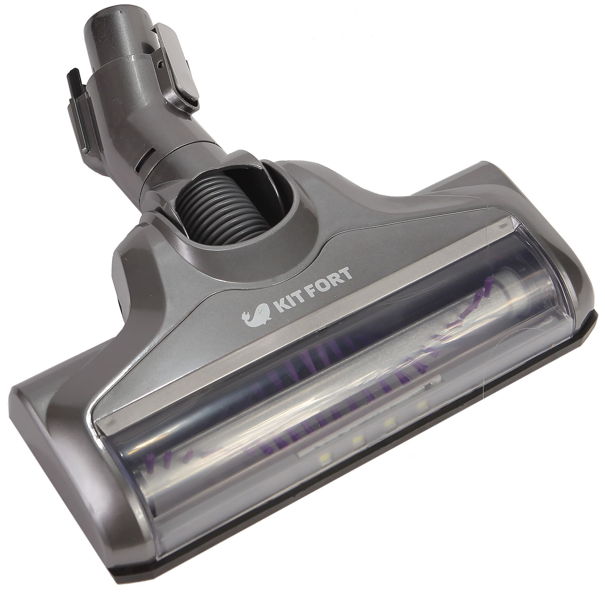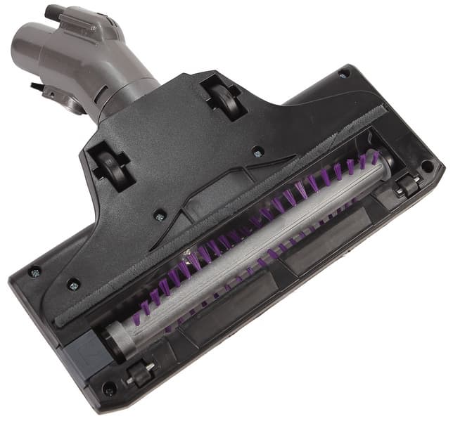 Ширина всей электрощетки 230 мм. Скользить по полу ей помогают два пластиковых ролика и два колеса под шарниром с покрышками из мягкого пластика. Снизу на корпусе щетки спереди есть три выреза для захвата мусора потоком воздуха непосредственно от стен и предметов обстановки. В передней части насадки закреплена полоска из жесткой резины, которая предохраняет мебель от последствий ударов щеткой. Питание для электромотора и подсветки передается от основного блока по проводникам в трубке, но при необходимости электрощетку можно закрепить непосредственно на основном блоке.