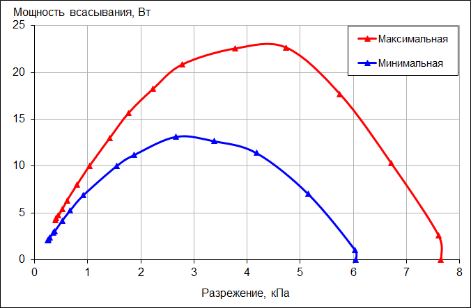 Мощность всасывания (что это такое и как мы ее измеряем, описано в отдельной статье) мы определяли при работе пылесоса без трубы и насадок. Зависимость мощности всасывания от создаваемого разрежения приведена на графике ниже: