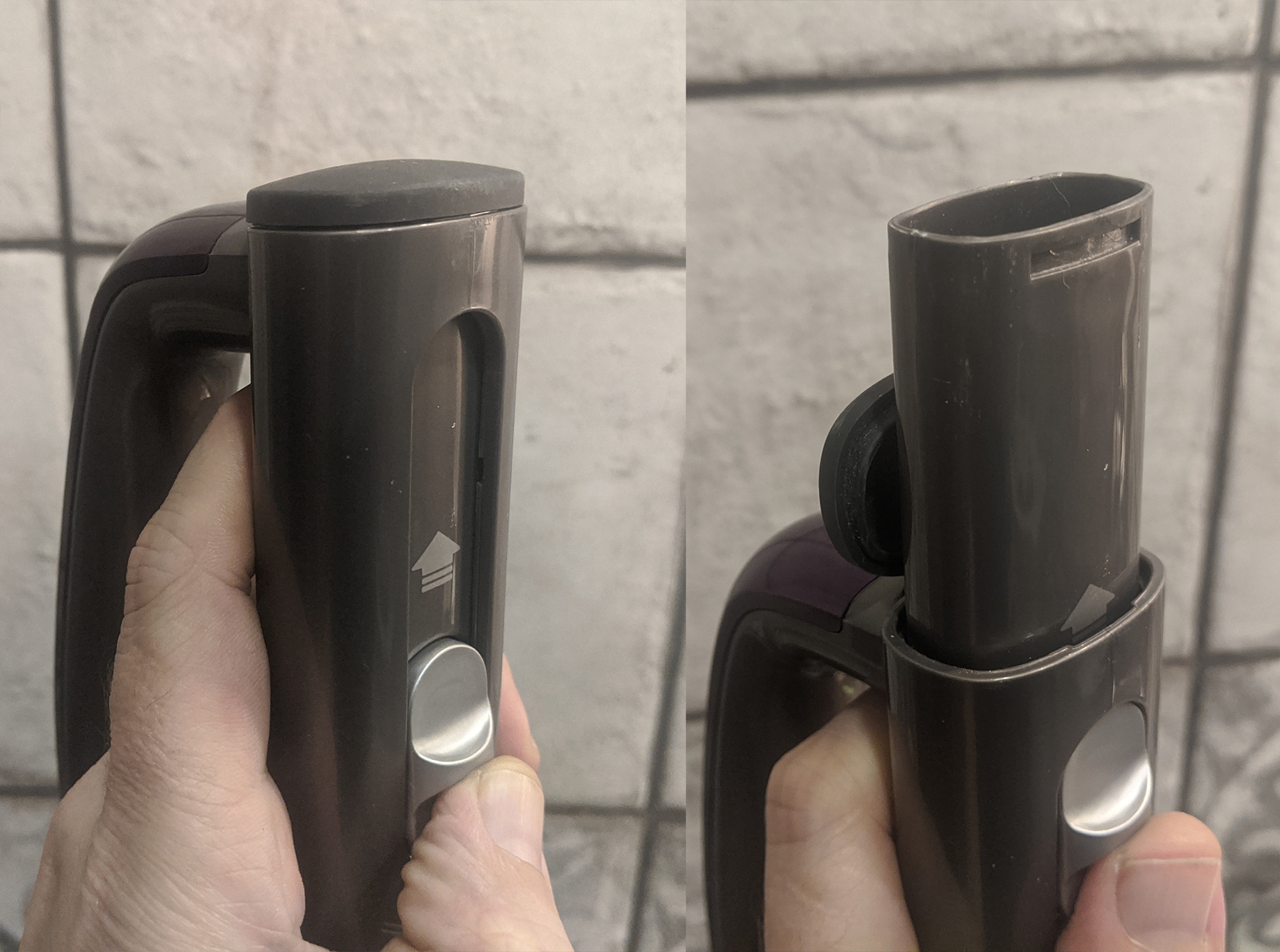 Для использовании трубки в качестве удлинительной следует отсоединить ее от напольной насадки, открыть заглушку в верхнем торце и выдвинуть выдвижной переходник при помощи кнопки на задней стороне ручки.