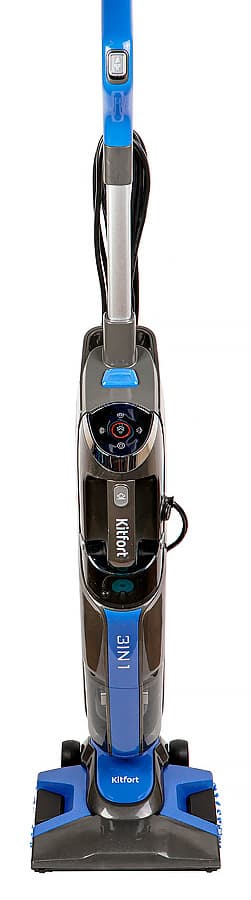 Пылесос Kitfort KT-555 выглядит как типичный вертикальный пылесос с функциями генерации пара. В его оформлении использован пластик темно-серого, темно-синего и серебристого цветов, панель управления парогенератора обрамлена хромированной рамкой. Цветовое решение показалось нам приятным на вид, стильным и немарким.