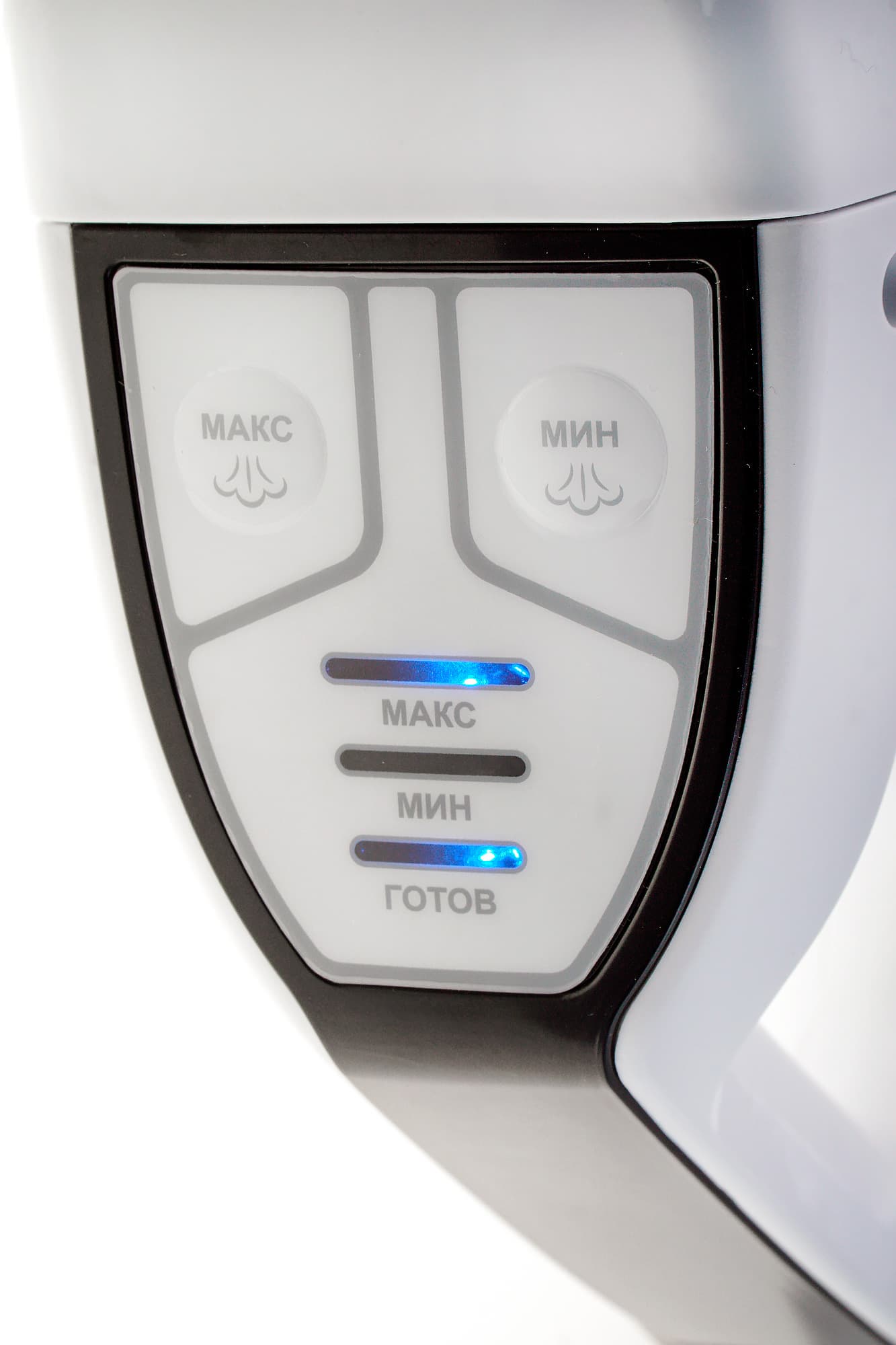 На панели управления парогенератора размещаются кнопки выбора режима пара, «Макс» и «Мин», и три индикатора: два из них соответствуют режимам парогенерации и включаются при нажатии на соответствующую кнопку, а третий, сигнализирующий о готовности пара, мигает при разогреве устройства и горит непрерывно, когда парогенератор готов к работе.