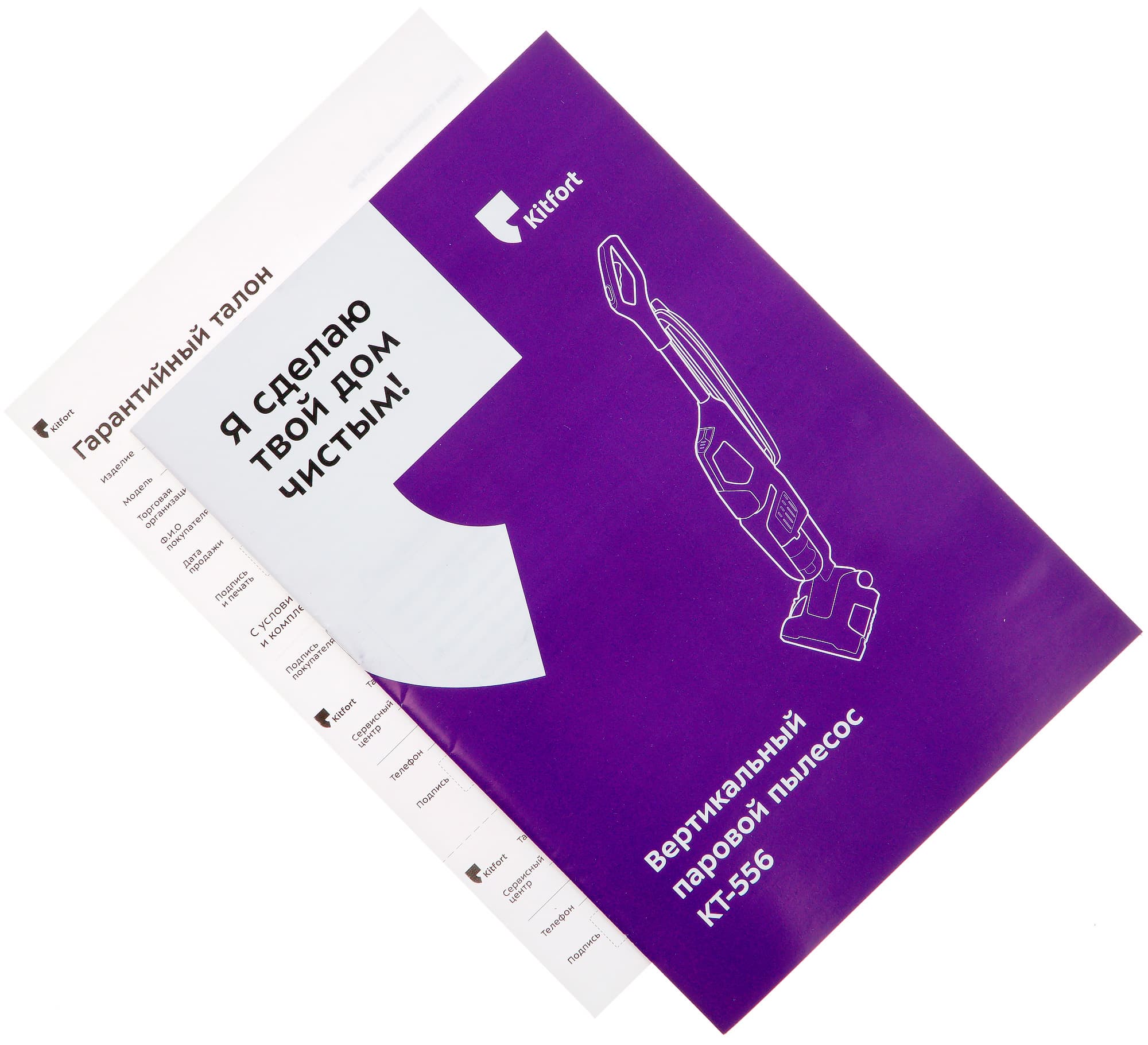 Инструкция, прилагаемая к паровой швабре KT-556, — это типичная для компании Kitfort книжка формата А5 в фиолетово-белой гамме.