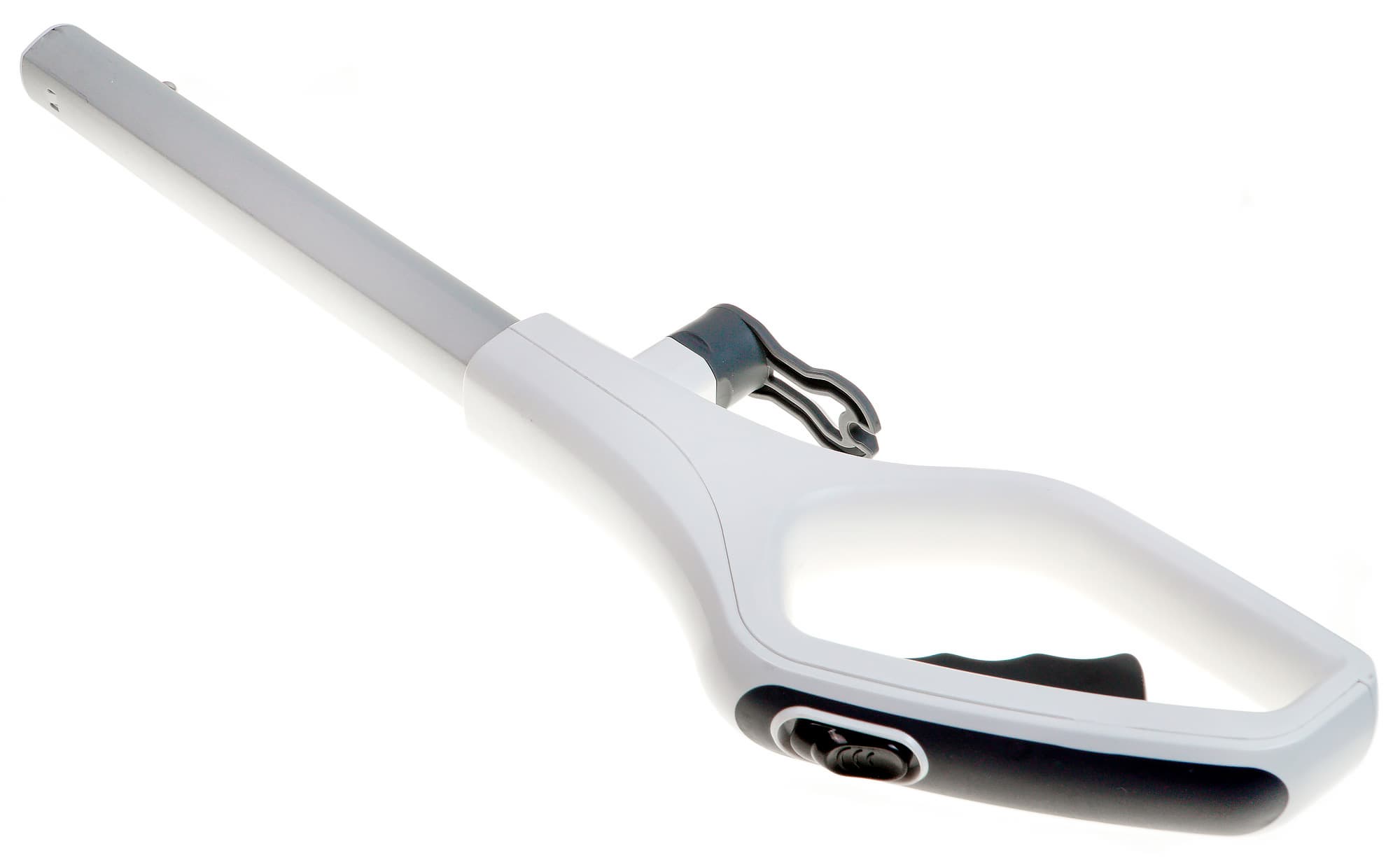 Рукоятка закреплена на алюминиевой удлинительной трубке серебристого цвета. На ее передней части имеется темно-серая, в тон другим декоративным элементам, противоскользящая вставка из пластика soft-touch, облегчающая удерживание пылесоса. На вставке расположен рычаг блокиратора подачи пара, рассчитанный на управление большим пальцем любой руки.