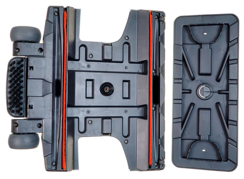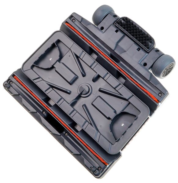 Щетка опирается на два пластиковых ролика, принимающих на себя основной вес пылесоса при уборке и хранении. За роликами, в задней части подошвы напольной насадки, имеется маленькая щетка, предназначенная для очистки сильных загрязнений. При необходимости ее можно опустить, нажав на нее (это также можно делать ногой).