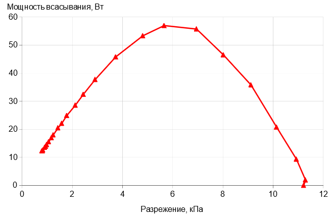 Мощность всасывания (что это такое и как мы ее измеряем, описано в отдельной статье) мы определяли при работе пылесоса без насадок. Зависимость мощности всасывания от создаваемого разрежения приведена на графике ниже:
