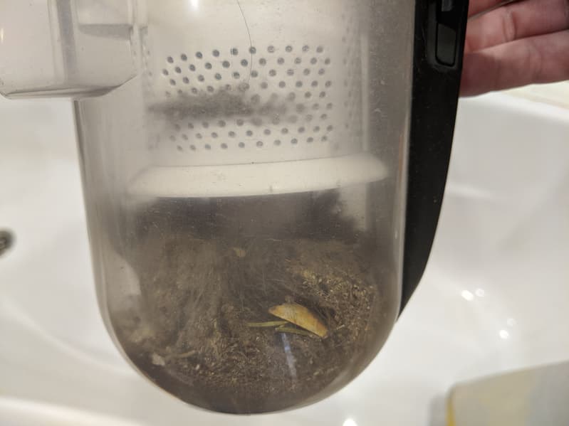 Уровень мусора в пылесборнике хорошо виден через прозрачный корпус. Конструкция циклонного фильтра оказалась достаточно эффективной — мусор крупной и средней фракции успешно отсекается циклоном.