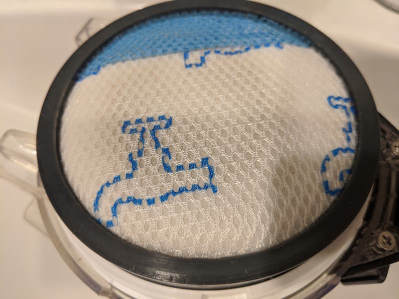 Фильтр тонкой очистки расположен над циклонным фильтром, он прижимается к нему пластиковым кольцом с байонетным креплением. Этот фильтр — довольно толстая «таблетка» из пористого материала, которая размещена между двумя синтетическими сетками из нетканого материала разной фактуры. На верхней сетке нанесено символическое изображение водопроводного крана: фильтр можно мыть. Боковые стороны фильтра тонкой очистки выполнены из черной резины, обеспечивающей плотное примыкание к корпусу пылесборника. Для удобства извлечения фильтра на верхней сетке сделан «карман» из ткани того же типа, но другого — синего — цвета. Чтобы вынуть фильтр, следует потянуть за этот карман.