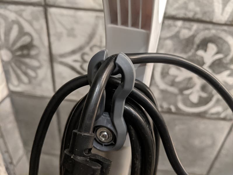 Как и большинство устройств этого типа, Kitfort KT-556 не оборудован отдельной системой намотки шнура — электрический шнур вручную зацепляется за две скобы на задней стороне паровой швабры.