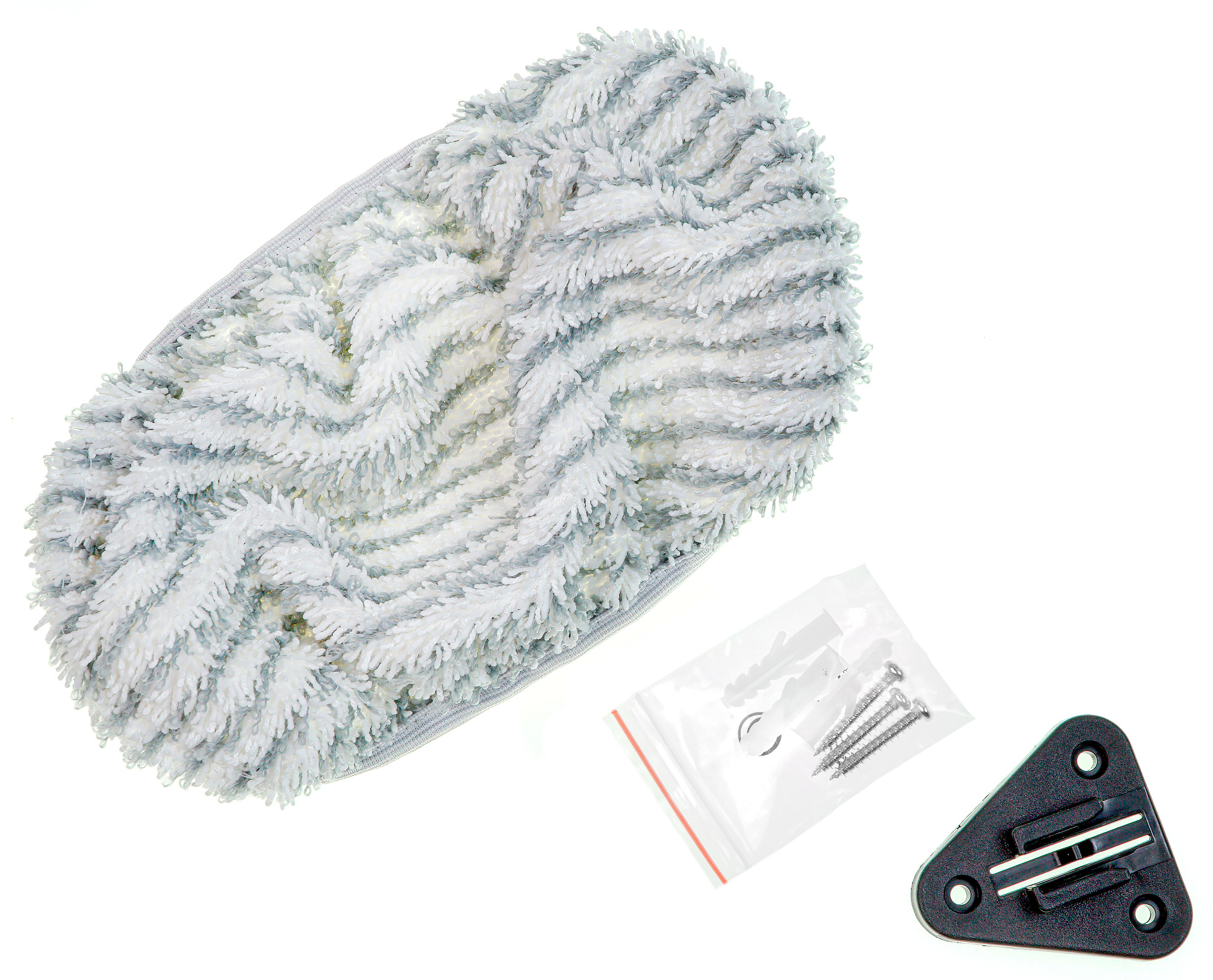 Пылесос комплектуется также половой тряпкой из микрофибры и несложным крючком для настенного крепления. К крючку прилагается комплект крепежа.
