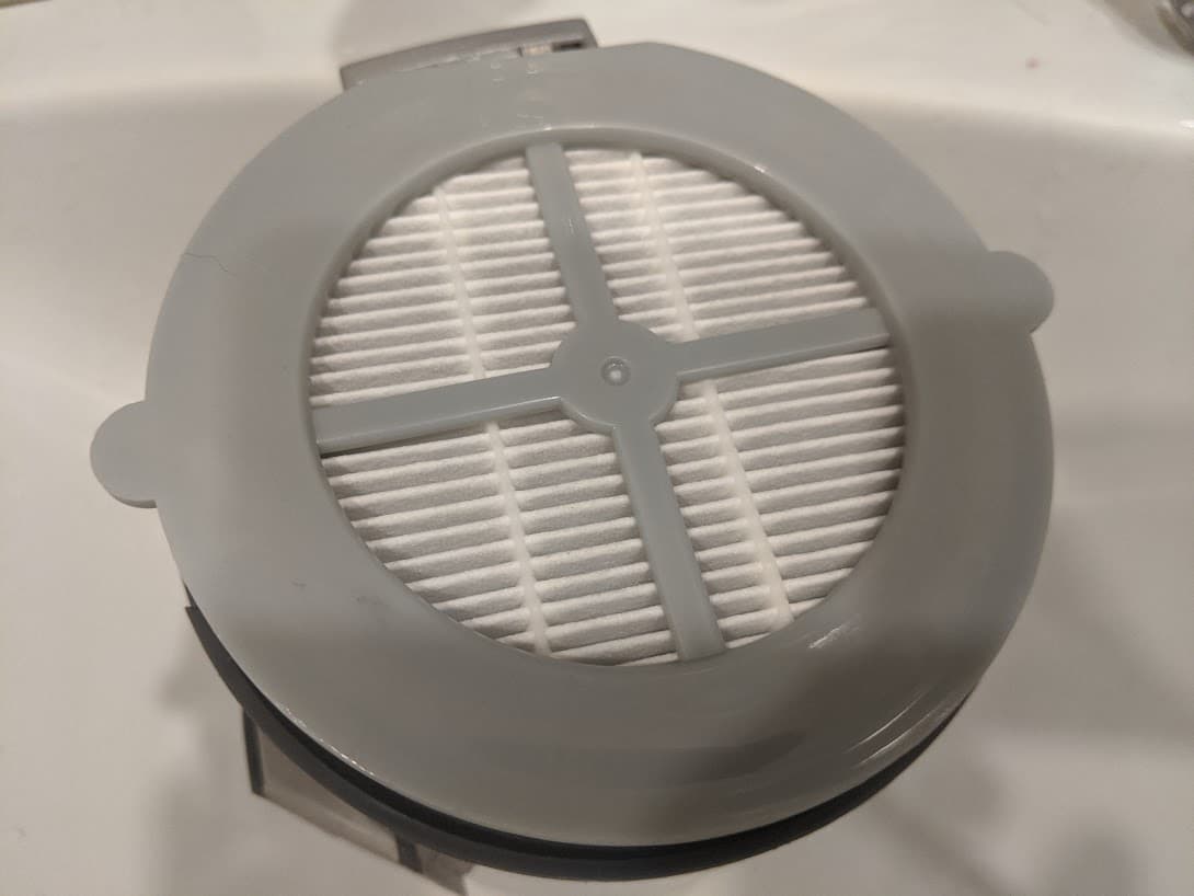 После циклонного поток воздуха с пылью попадает на фильтр тонкой очистки. Он также тривиален по конструкции и представляет собой «таблетку» из собранного в гармошку HEPA-фильтра. Он также держится в корпусе силой трения и не имеет дополнительных креплений.