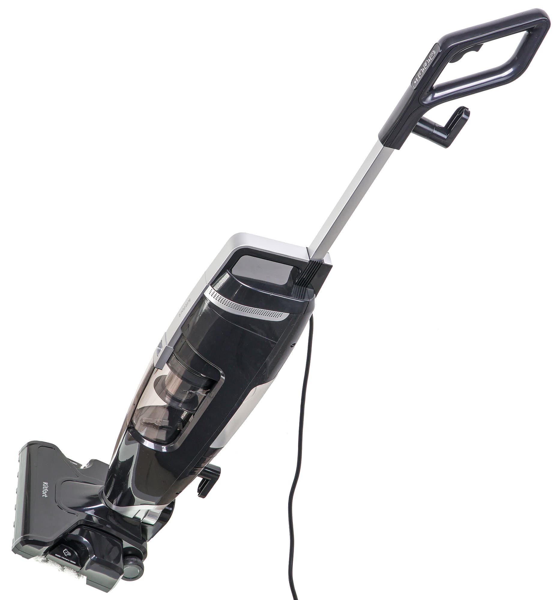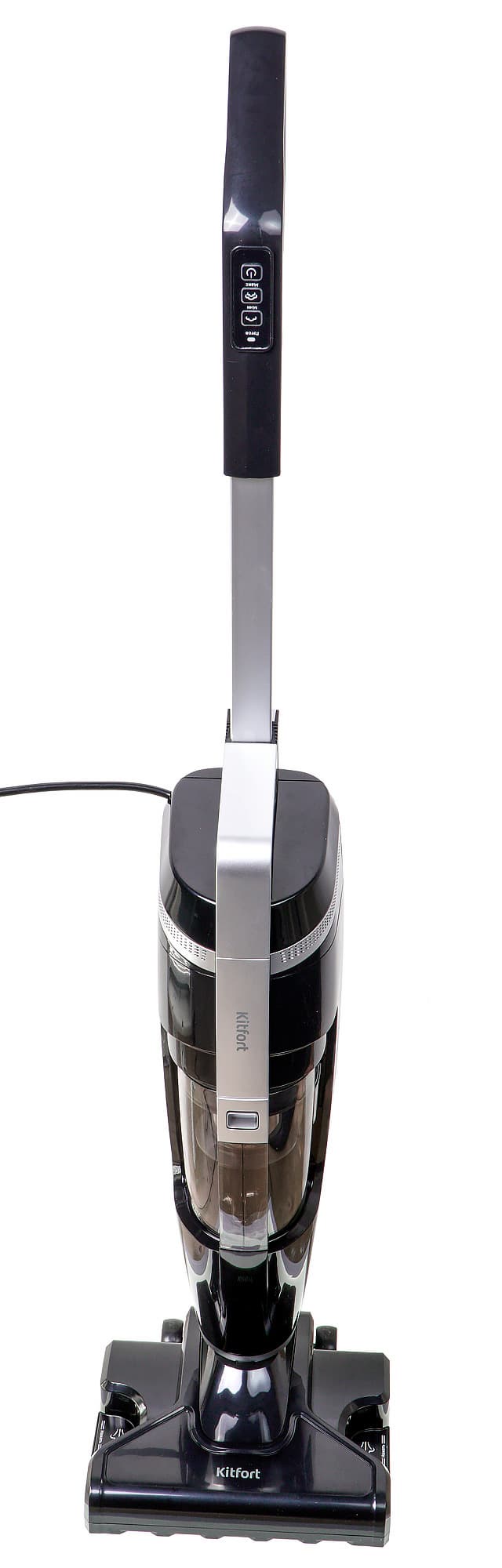 Kitfort KT-575 оформлен в строгой черно-серебристой гамме, без ярких броских элементов, и выглядит очень стильно. Его конструкция традиционна для вертикальных паровых пылесосов: удлинительная ручка с элементами управления, корпус со встроенным несъемным парогенератором (в его нижней части расположен мусоросборник), и единственная насадка для сухой и влажной уборки пола, служащая устройству одновременно и опорой.