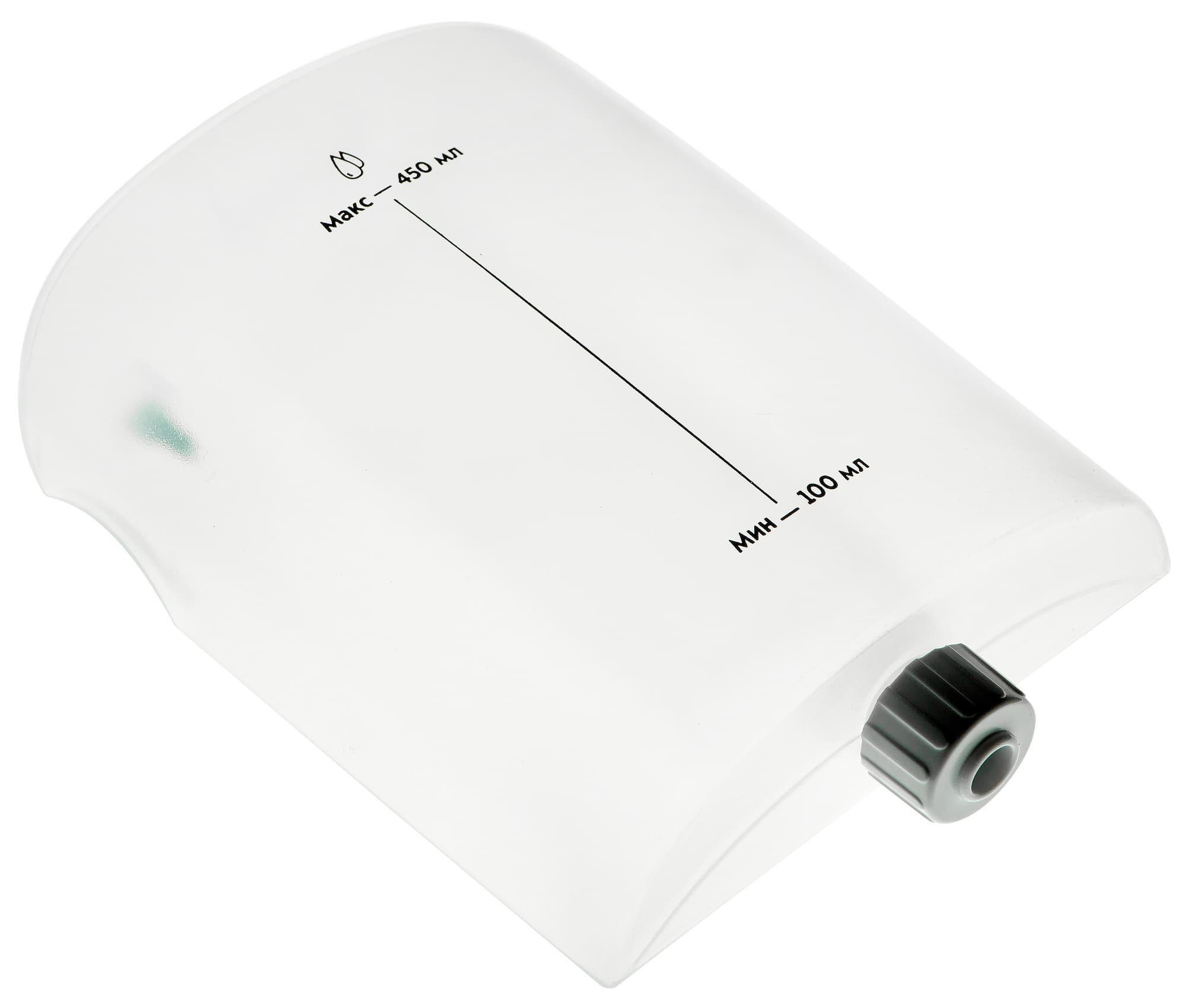 Резервуар для воды, расположенный с задней стороны корпуса, выполнен из довольно мягкого полупрозрачного пластика светлого цвета. На его боковой стороне нанесены отметки минимального (100 мл) и максимального (450 мл) уровней жидкости. На нижней стороне емкости — винтовая заливная пробка, служащая одновременно водяным клапаном, на верхней — простой резиновый ниппельный клапан, предотвращающий разрежение воздуха внутри. Под резервуаром находится съемный, но необслуживаемый водяной фильтр из темного, почти непрозрачного пластика. На просвет при ярком освещении видно, что состоит он из двух отсеков, заполненных пористым материалом разной структуры: на входе более крупным, на выходе помельче.