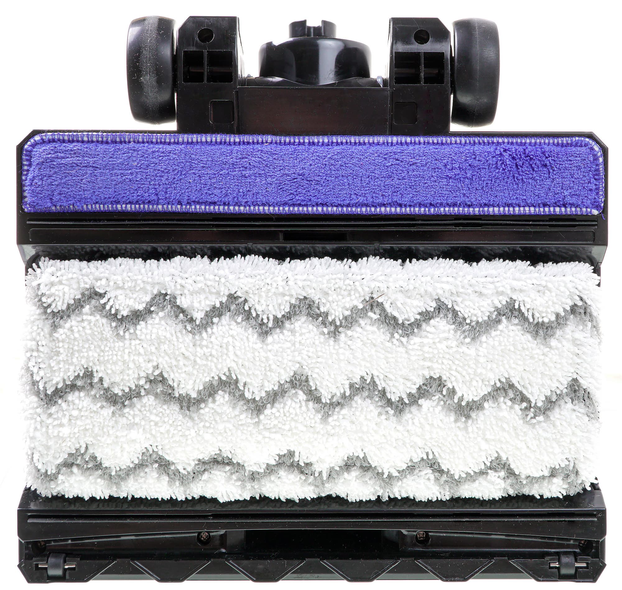 Половая насадка опирается на два обрезиненных ролика, которые принимают на себя основной вес пылесоса при уборке и хранении. На нижней стороне насадки крепится держатель с тряпкой для отпаривания покрытия. Задняя часть снабжена узкой тряпкой, предназначенной для сбора лишней воды с пола.