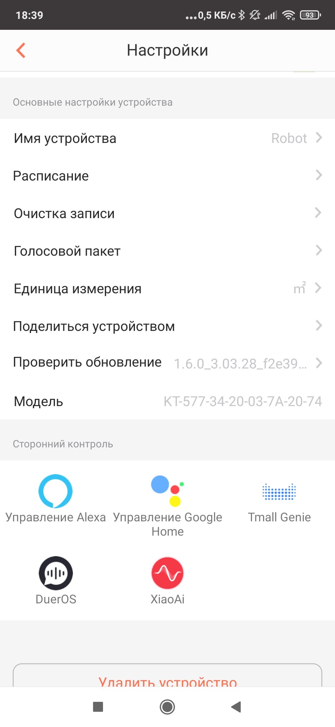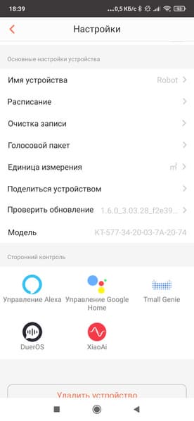 После успешного соединения появится вкладка с настройками, позволяющая получить информацию о пылесосе, обновить прошивку, предоставить другим пользователям доступ к прибору и т. п.