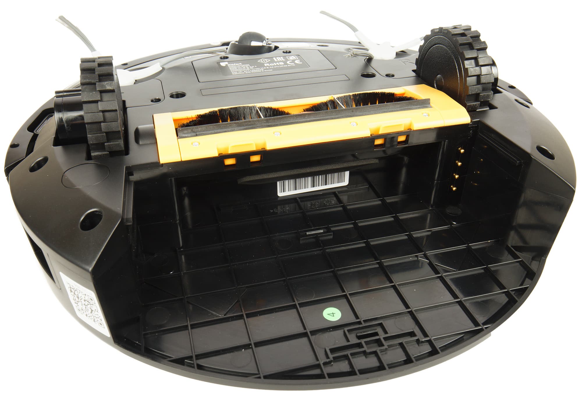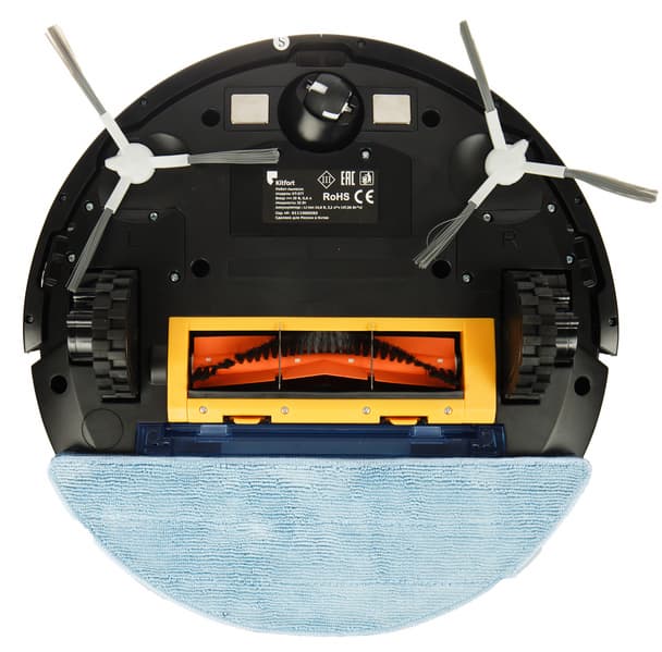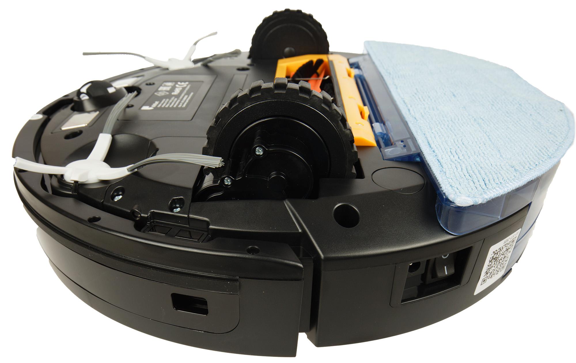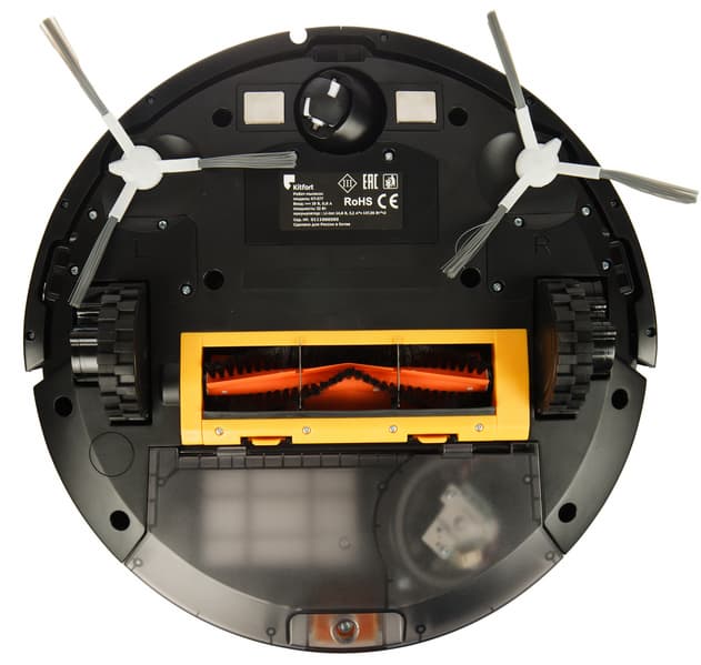 Направляющее колесо пластиковое. Оно заключено в пластиковую же сферу, допускающую свободное вращение на 360°. По обе стороны от колеса размещаются контакты для зарядки на базе. Также в передней части корпуса можно увидеть гнезда для крепления боковых щеток, а по центру и по бокам — окошки оптических (инфракрасных) датчиков поверхности.