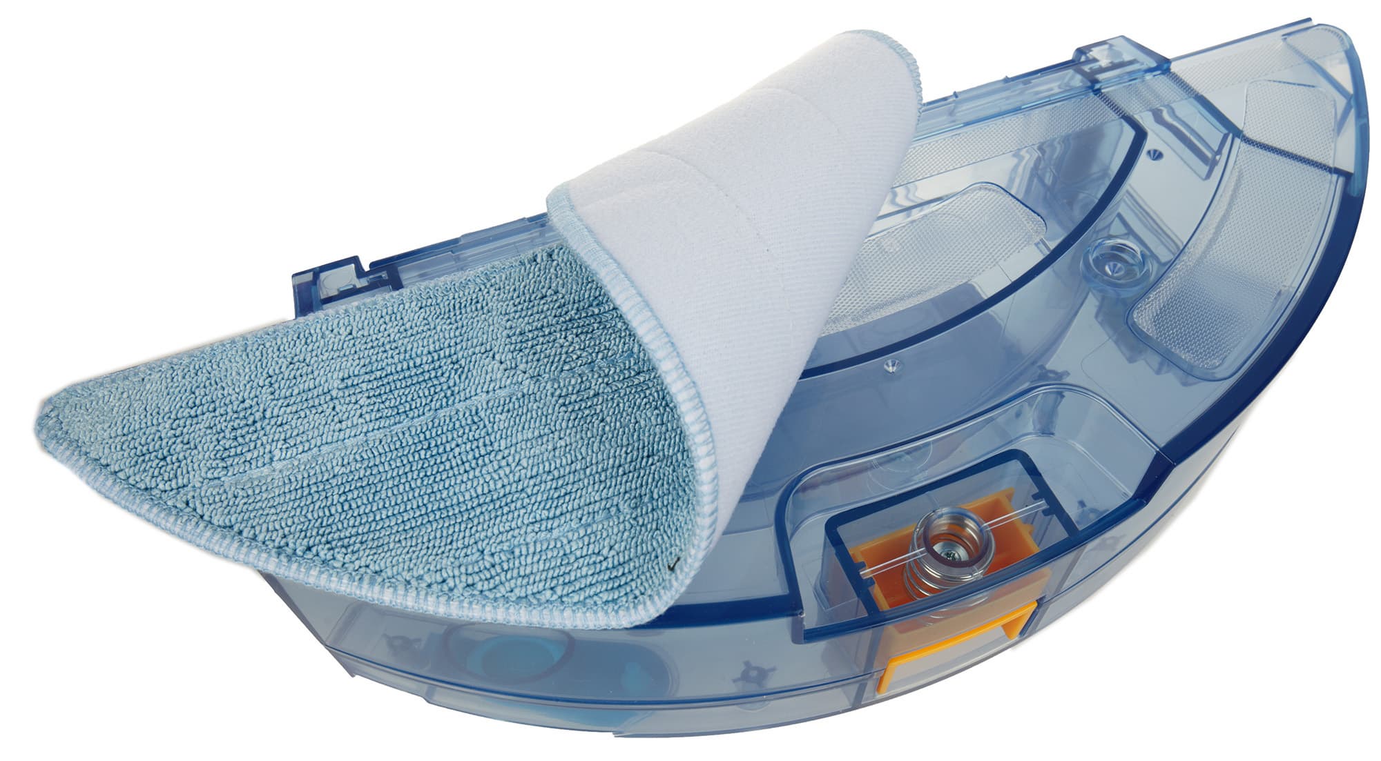 Вода, увлажняющая тряпку, поступает из бака через пять миниатюрных отверстий. Отметим, что липучки-велкро приклеены к корпусу модуля не идеально: местами они проклеены недостаточно хорошо, и мы опасаемся, что в будущем это может стать проблемой (липучки отклеятся).