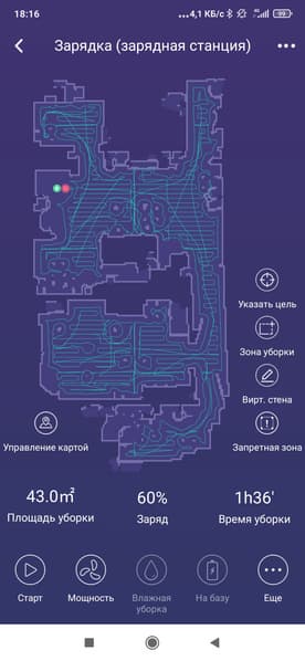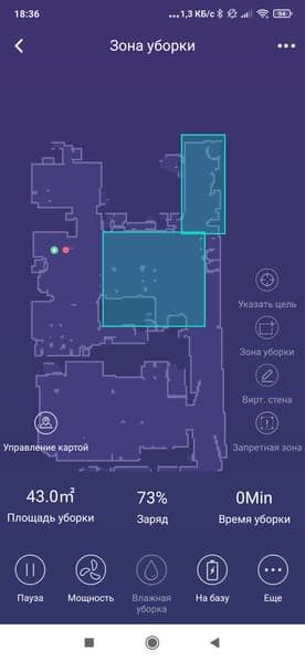 - Установка на карте зон для уборки, выбор комнат для уборки