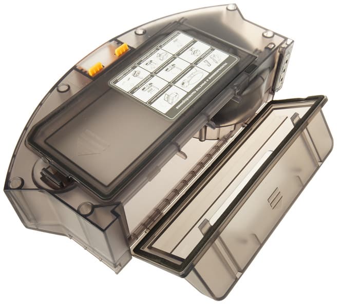 Откидная крышка фиксируется на защелке. На контейнере можно найти наклейку-подсказку с правилами очистки пылесборника, так что заглядывать в инструкцию лишний раз не придется.