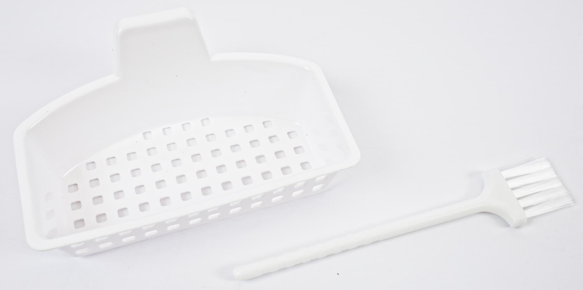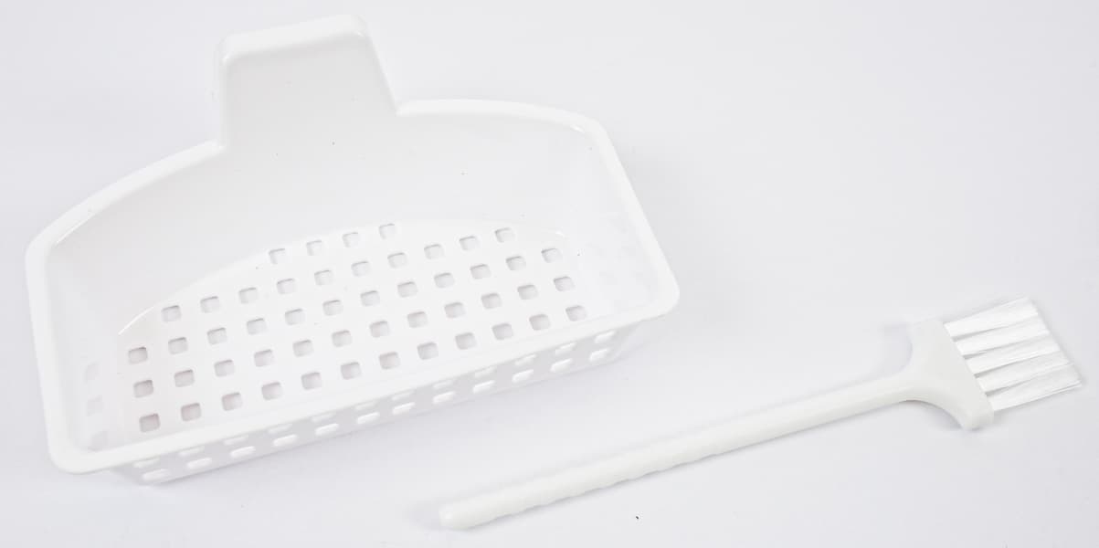 Корзинка для крупного мусора и щеточка для чистки выполнены из белого, прочного на вид пластика.