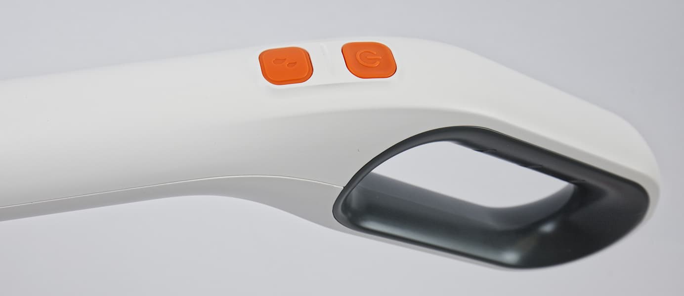 Электрошвабра управляется двумя кнопками расположенными на ручке. Кнопкой включения выполняется запуск и остановка прибора, а вторая кнопка служит для активации режима самоочистки, когда электрошвабра установлена на базу.