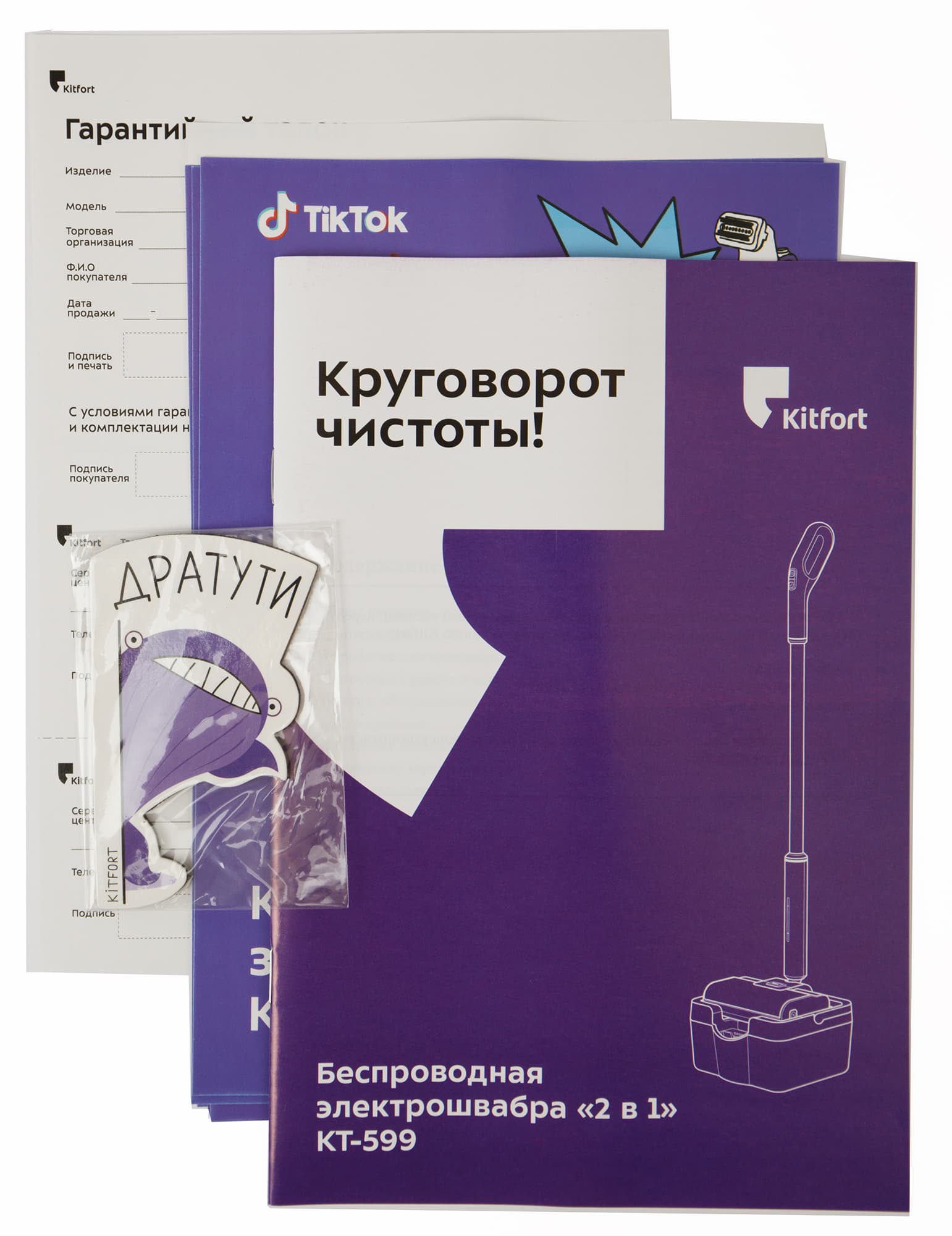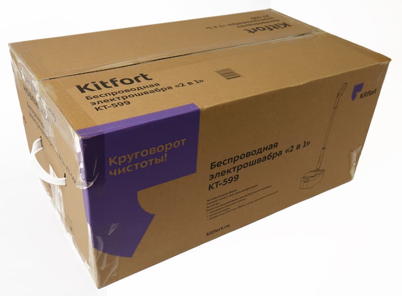 Электрошвабра Kitfort KT-599 поставляется в коробке из коричневого картона, оформленной в фирменном стиле Kitfort. На лицевой стороне — фиолетовая вставка с коротким слоганом «Круговорот чистоты». На боковых гранях упаковки мы видим схематическое изображение прибора, а также описание его основных особенностей и технических характеристик. Внутри прибор защищен от ударов с помощью пенопластовых вкладок, а все детали дополнительно упакованы в полиэтиленовые пакеты. Коробка оснащена ручкой для переноски.
