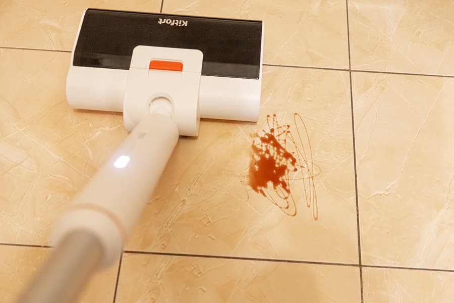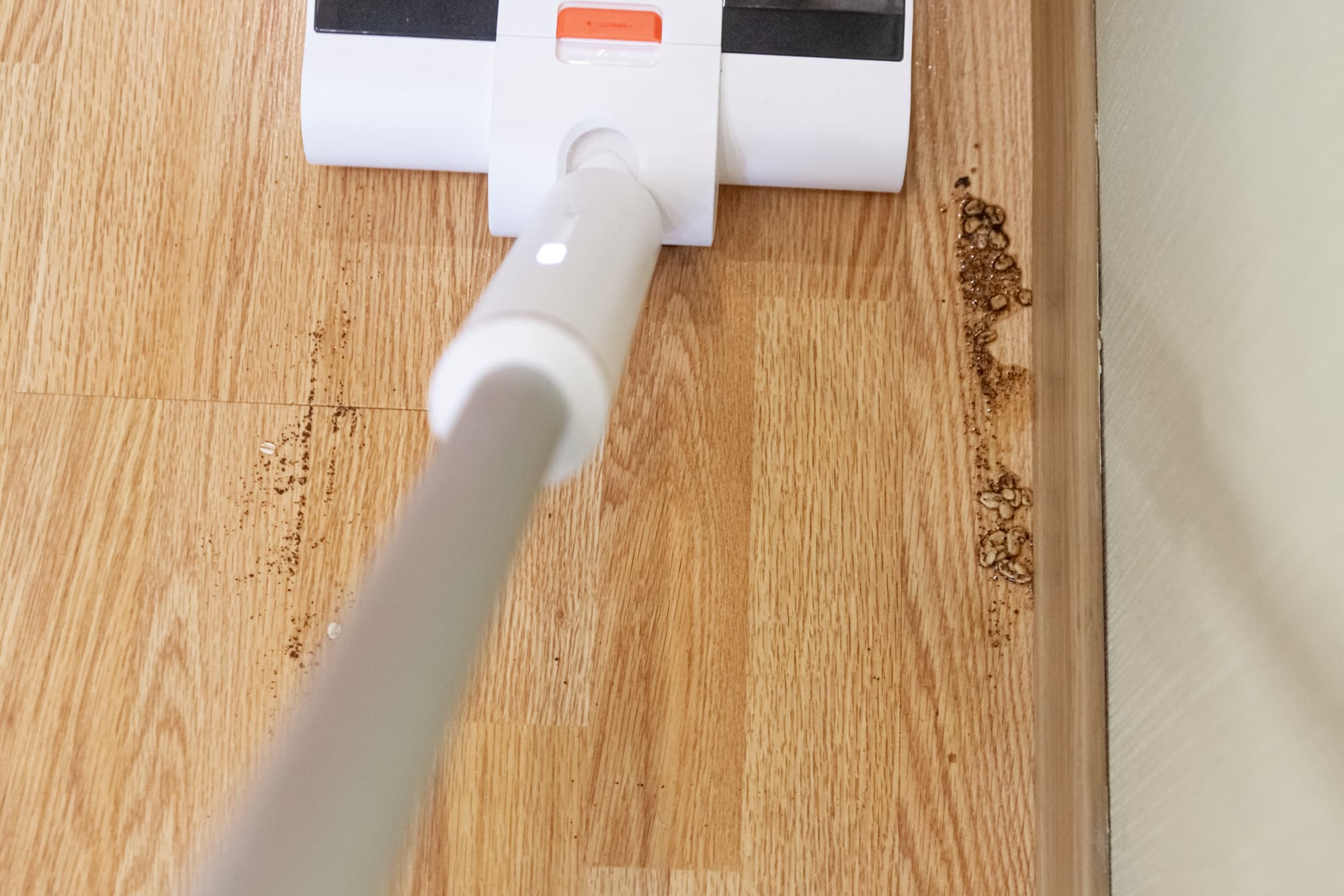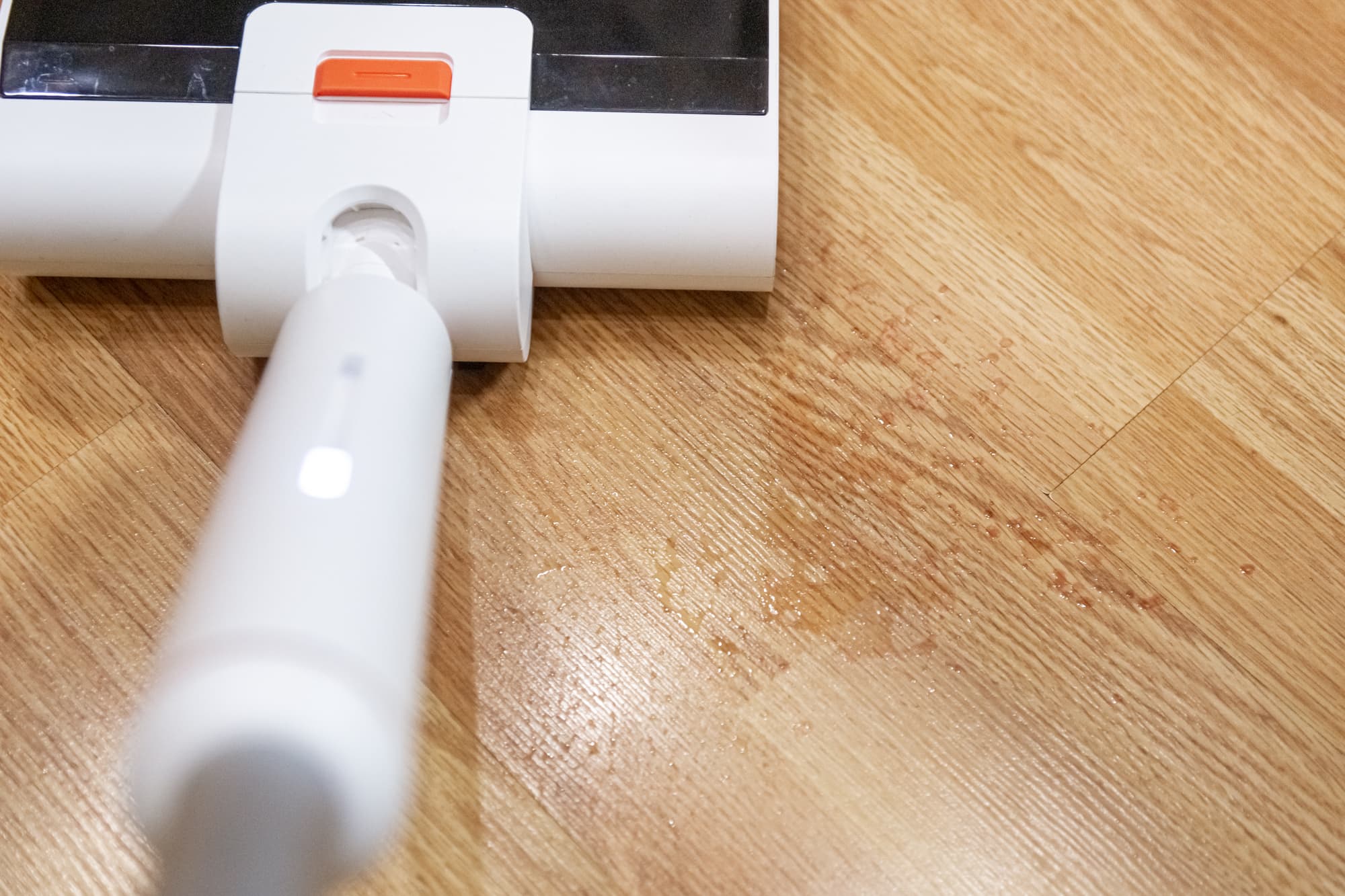 Пройдясь электрошваброй с влажным валиком по луже один раз, мы обнаружили, что основная масса была убрана и остались лишь совсем небольшие частички кофе.