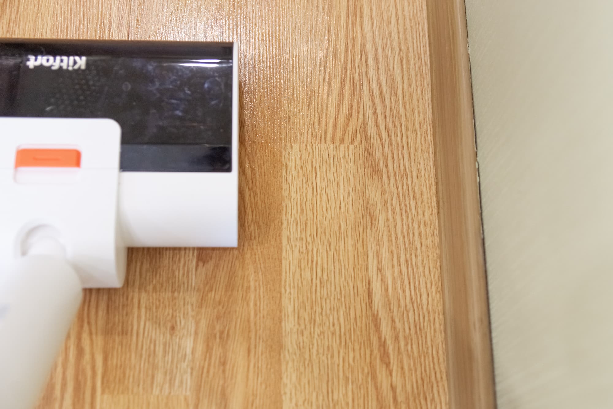 Плинтус после уборки безусловно придется протереть самостоятельно, но что нас искренне порадовало, боковая сторона щетки действительно выметает из-под него если не всю пыль, то процентов 90 точно. Это серьезная заявка на успех, далеко не все подобные приборы на это способны.