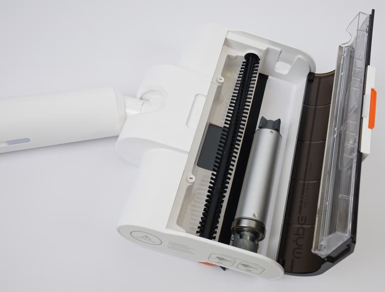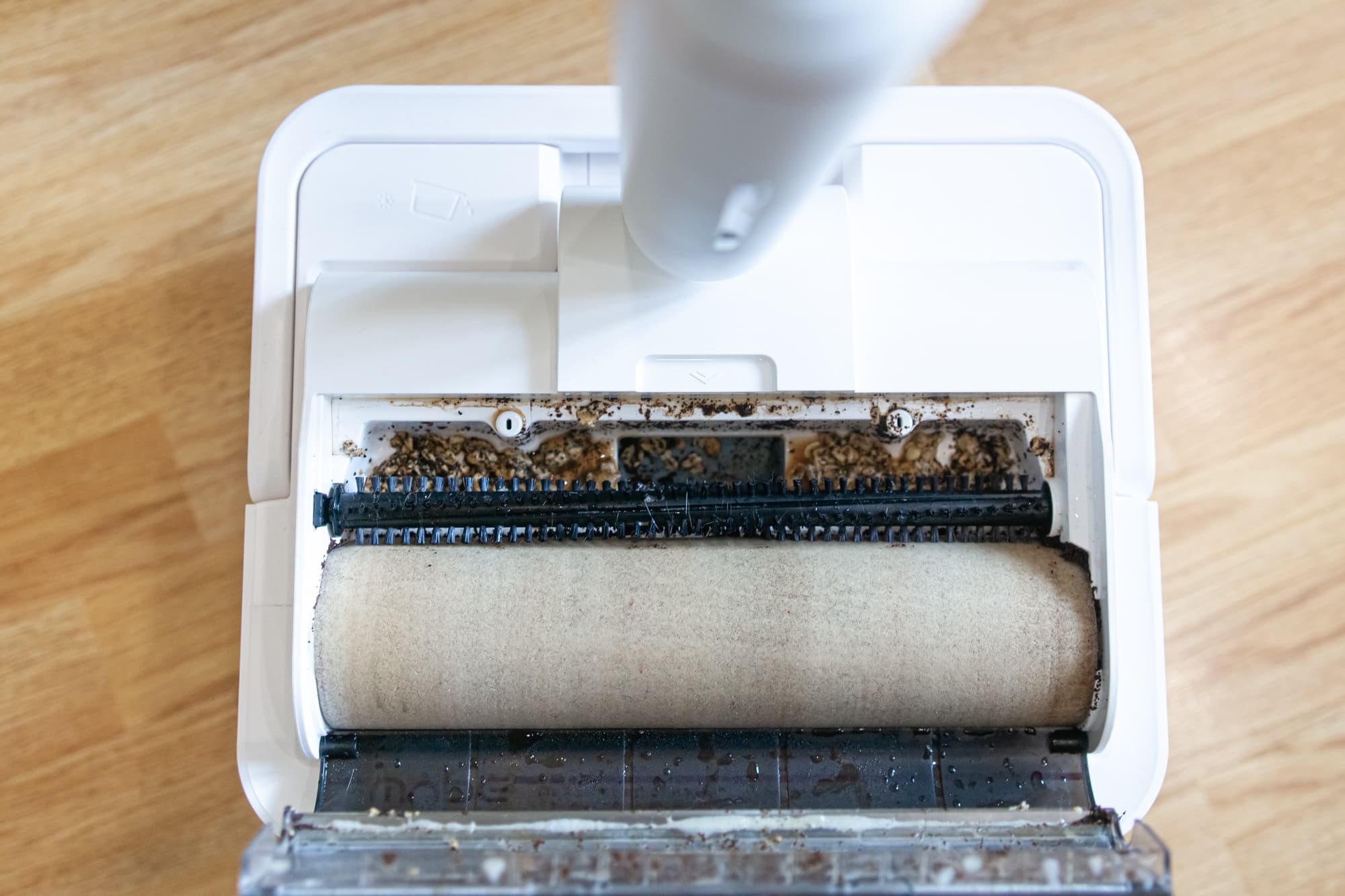 Конструкция корпуса напольной щетки позволяет прибору самостоятельно подметать мусор, одновременно мыть пол, а после самоочищаться и выжиматься. Перспектива не вдыхать пыль при очистке пылесборника и не мочить руки в грязной воде, отжимая тряпку, нас, признаться, заинтриговала.