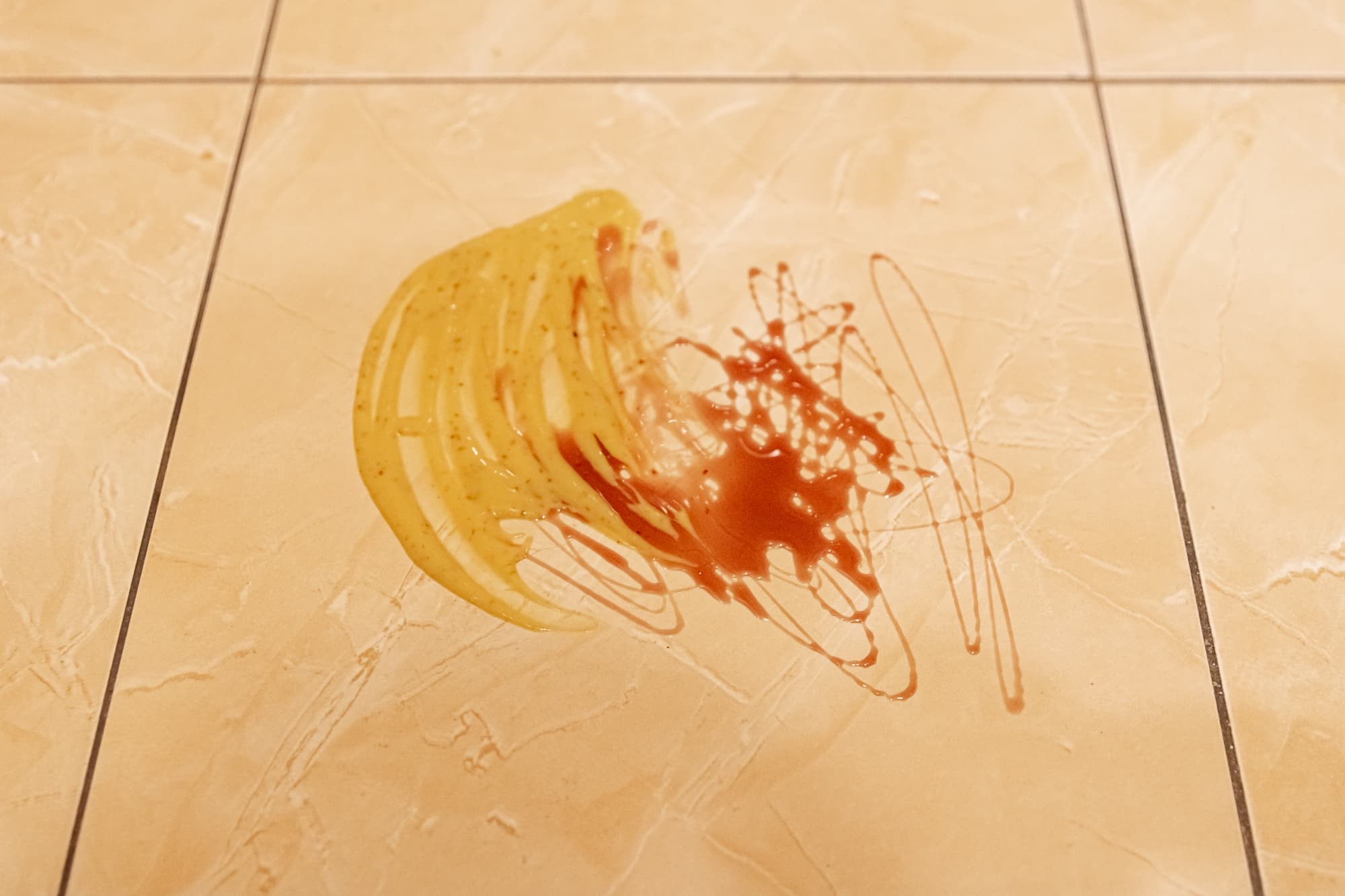 Теперь мы размазали по кафелю горчицу и густой гранатовый соус.