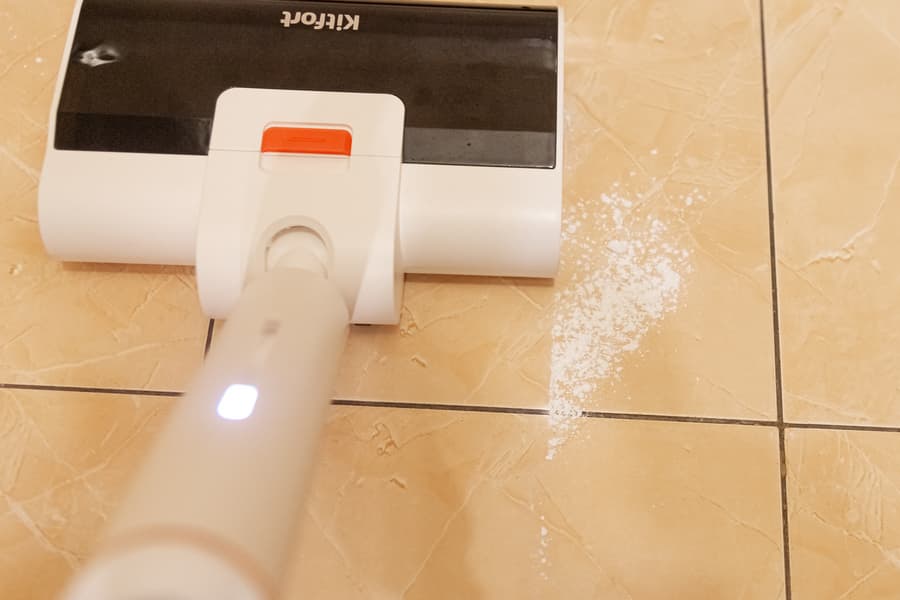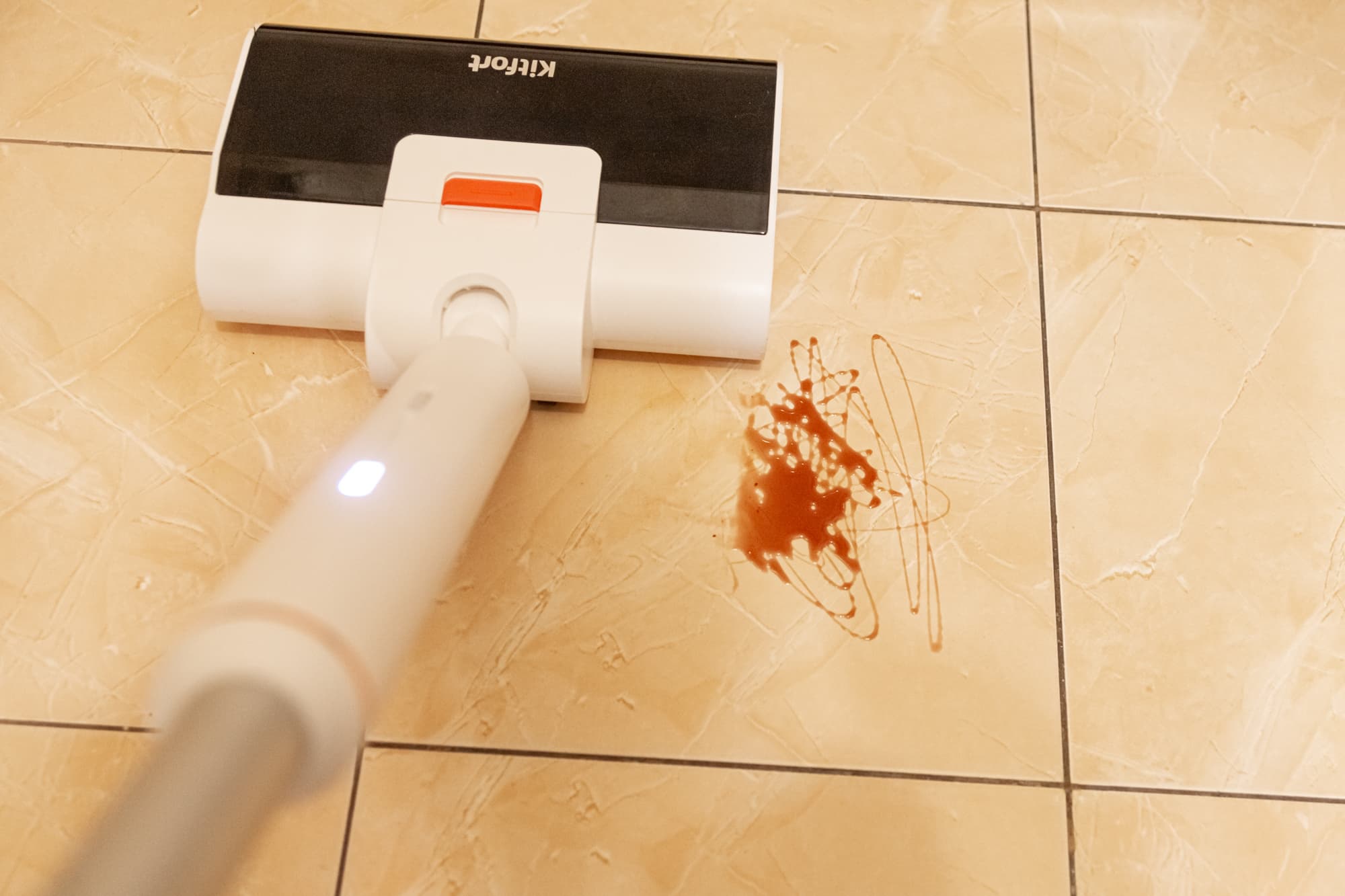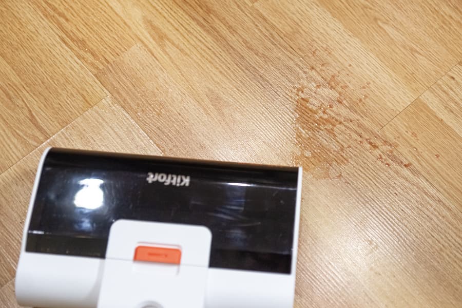 Проверим, как Kitfort KT-599 справится с первым заданием и насколько тщательно вымоет пол у плинтуса. Мы разлили сладкий черный чай, сверху присыпали молотым кофе и геркулесовой крупой. Дали немного подсохнуть и приступили к тесту.