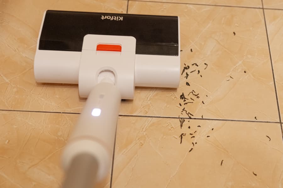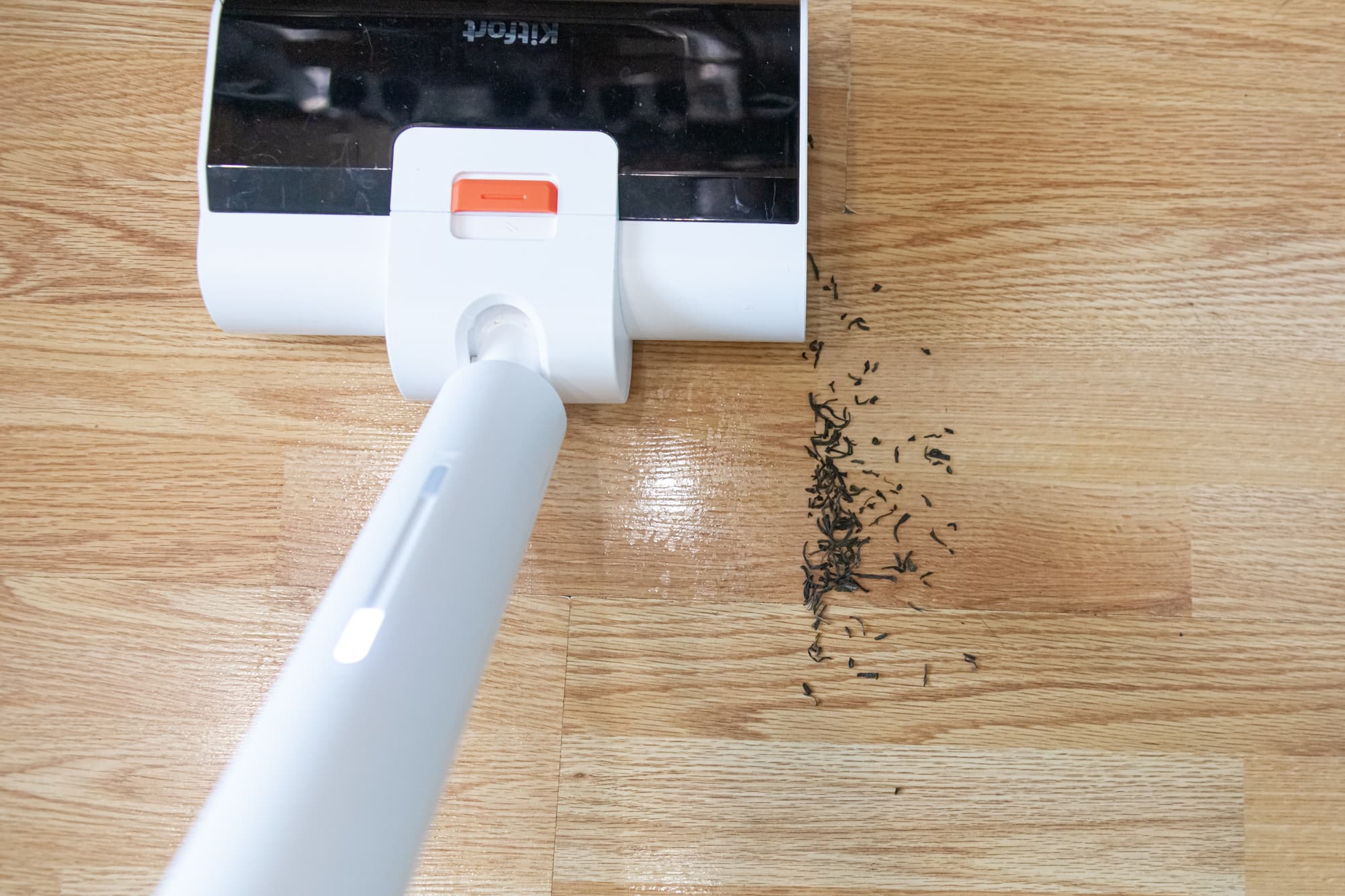 Далее мы решили проверить Kitfort KT-599 на предмет собирания сухого мусора. Нас в первую очередь интересовало, не станет ли швабра пропускать или ронять частицы мусора снова на пол. Для этого по полу было рассыпано некоторое количество зеленого чая. Швабра с первого раза собрала весь мусор и назад на пол его не возвращала.